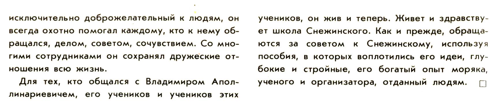 Для тех, кто общался с Владимиром Аполлинариевичем, его учеников и учеников этих учеников, он жив и теперь. Живет и здравствует школа Снежинского. Как и прежде, обращаются за советом к Снежинскому, используя пособия, в которых воплотились его идеи, глубокие и стройные, его богатый опыт моряка, ученого и организатора, отданный людям.