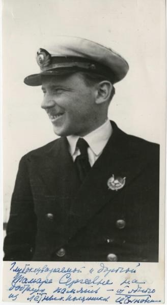 Челюскинцы в гостях у артистов театра «Сатира». Москва, 1934 г. Во втором ряду сидят лётчики - первые Герои Советского Союза: Н.П.Каманин (в центре, в форме), А.В.Ляпидевский (слева от него), В.С.Молоков (справа от него). В третьем ряду сидят: О.Ю.Шмидт - начальник ГУСМП (с бородой), лётчики М.Т.Слепнёв (справа от него) и Б.Г.Чухновский (третий слева от него). Стоят лётчики: первый слева - М.В.Доронин, третий - С.А.Леваневский.