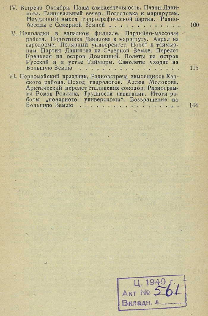 Ежедневно по утрам мы отправлялись на катере к причалу, где находился склад продуктов питания и других необходимых для зимовки материалов. Сергей Иванович расписывался в накладных и мы понемногу ящики переносили на причал. Эту работу мы выполняли в течение трех наших поездок. Как потом попадали наши продукты на корабль, мы не интересовались. Отплытие в Арктику было назначено на 1-е августа. Дни, которые остались до нашего отплытия мы использовали для знакомства с городом. Но этот период был очень коротким и в памяти оставил мало. Я помню, что дважды я посещал ресторан «Арктику», где я танцевал западные танцы, которыми я владел тогда в достаточной мере и вызывал аплодисменты у присутствующих там. Запомнился случай после которого все, находившиеся тогда в Архангельске полярники, срезали свои нарукавные нашивки. В тот год в Арктику должно было собраться до 200 полярников для отправки на полярные станции. В городе появление такого количества людей с морскими нашивками было заметным. Особенно было заметным появление людей с нашивками высшего командного состава. Двух из них мы знали. Это начальник станции «мыс Челюскина»- РУЗОВ и начальник станции «бухта ПРОНЧИЩЕВОЙ»- КИНГИПЕВЦОВ. Первый, бывший в Красной армии комдивом с двумя ромбами одел форму военного моряка с одной широкой и двумя средними, что соответствовало званию вице-адмирала ВМФ второй - равносильно своему воинскому званию надел форму контр-адмирала. Замечу, что тогда только нарождался наш северный флот с базой в Архангельске или рядом с ним. Вскоре после появления нас в Архангельске, военный патруль пригласил наших уважаемых, комдива и комбрига в комендатуру, где им объяснили, что в городе старшим военным начальником является капитан III ранга и что появление в городе адмиралов смущает военных моряков, и тем более наличие большого количества людей с нашивками среднего командного состава. Комендант потребовал не появляться полярникам в городе в военно-морской форме. Узнав об этом, мы свои нашивки срезали и военные моряки успокоились.