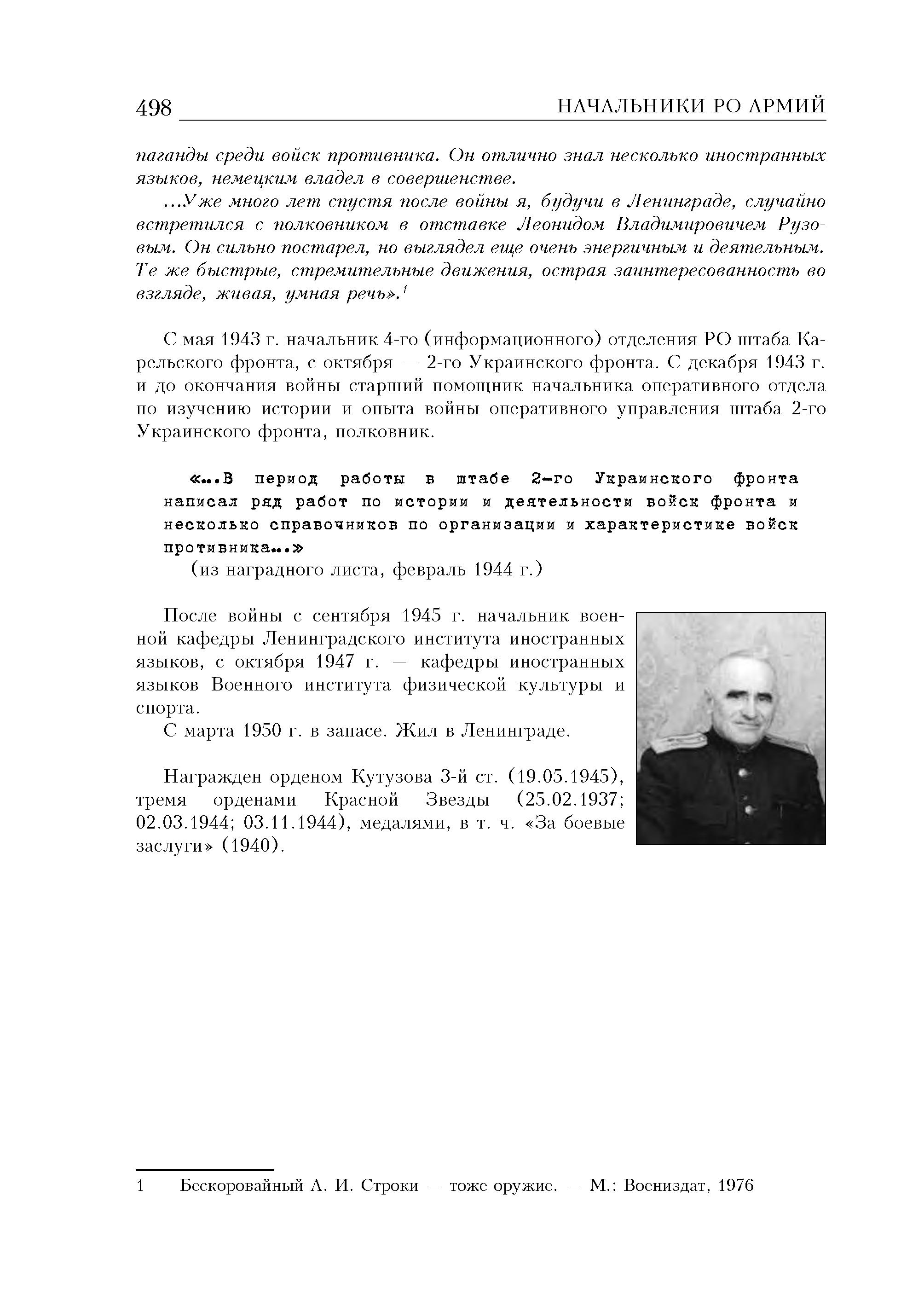 Постоянную деловую помощь получала от Рузова и наша редакция. Ведь в его руках был очень интересный материал: протоколы допросов пленных, их рассказы. Леонид Владимирович часто выступал в газете. Его статьи, построенные на показаниях пленных и разоблачающие гитлеровский режим, помогали воинам лучше увидеть настоящее лицо врага.