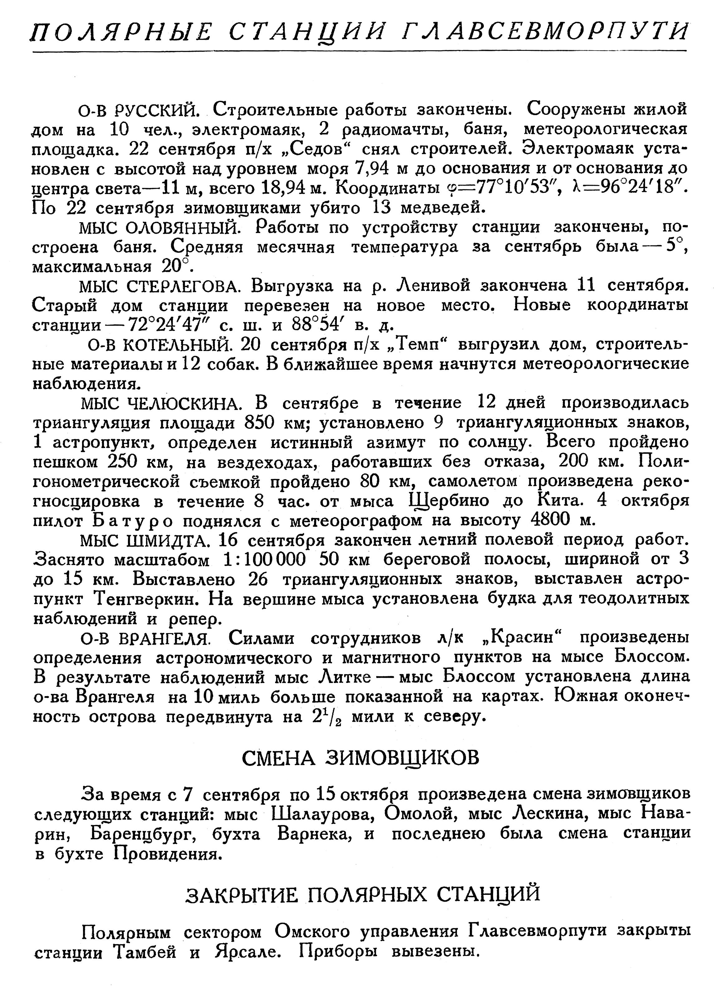 МЫС ШМИДА. Выполнена тридцатидвухсуточная серия ежечасных футшточных наблюдений. В феврале был установлен мареограф, который работал бесперебойно до конца апреля. Произведена съемка и составлены планы трех бухт в районе мыса Шмидта. Промеры в этих бухтах были сделаны еще осенью.