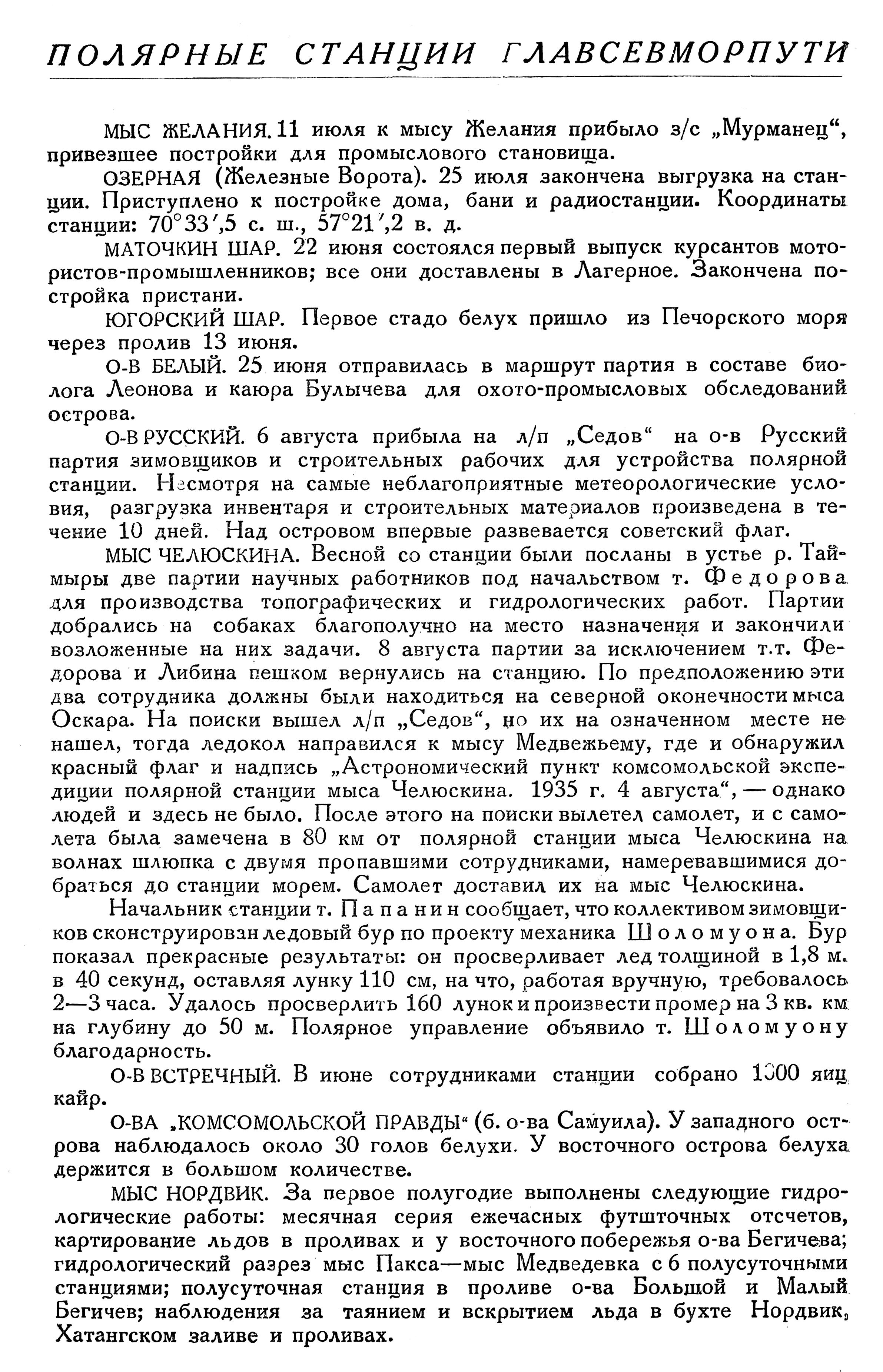 МЫС ОЛОВЯННЫЙ. Начальник полярной станции т. Э. Т. Кренкель сообщает, что механиком Meхренгеймом (так в тексте оригинала), помимо его прямых обязанностей, организован песцовый промысел: уже добыто 39 песцов и 1 медведь. Сотрудники станции готовятся к обслуживанию гидрологической партии мыса Челюскина, которая будет проводить 15-дневные наблюдения в проливе Шокальского.