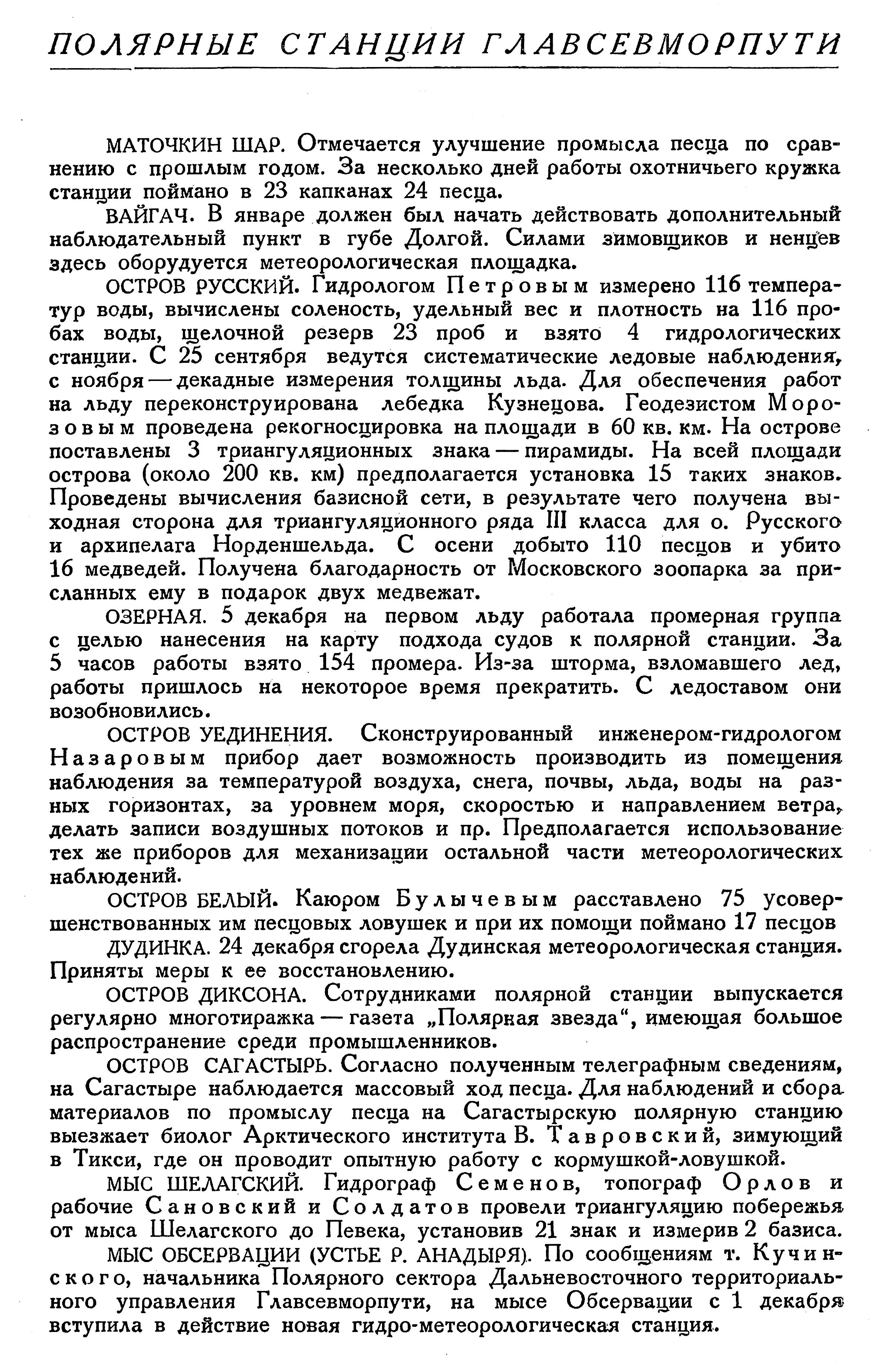 ОСТРОВ РУССКИЙ. Гидрологом Петровым измерено 116 температур воды, вычислены соленость, удельный вес и плотность на 116 пробах воды, щелочной резерв 23 проб и взято 4 гидрологических станции. С 25 сентября ведутся систематические ледовые наблюдения, с ноября — декадные измерения толщины льда. Для обеспечения работ на льду переконструирована лебедка Кузнецова. Геодезистом Морозовым проведена рекогносцировка на площади в 60 кв. км. На острове поставлены 3 триангуляционных знака — пирамиды. На всей площади острова (около 200 кв. км) предполагается установка 15 таких знаков. Проведены вычисления базисной сети, в результате чего получена выходная сторона для триангуляционного ряда III класса для о. Русского и архипелага Норденшельда. С осени добыто 110 песцов и убито 16 медведей. Получена благодарность от Московского зоопарка за присланных ему в подарок двух медвежат.