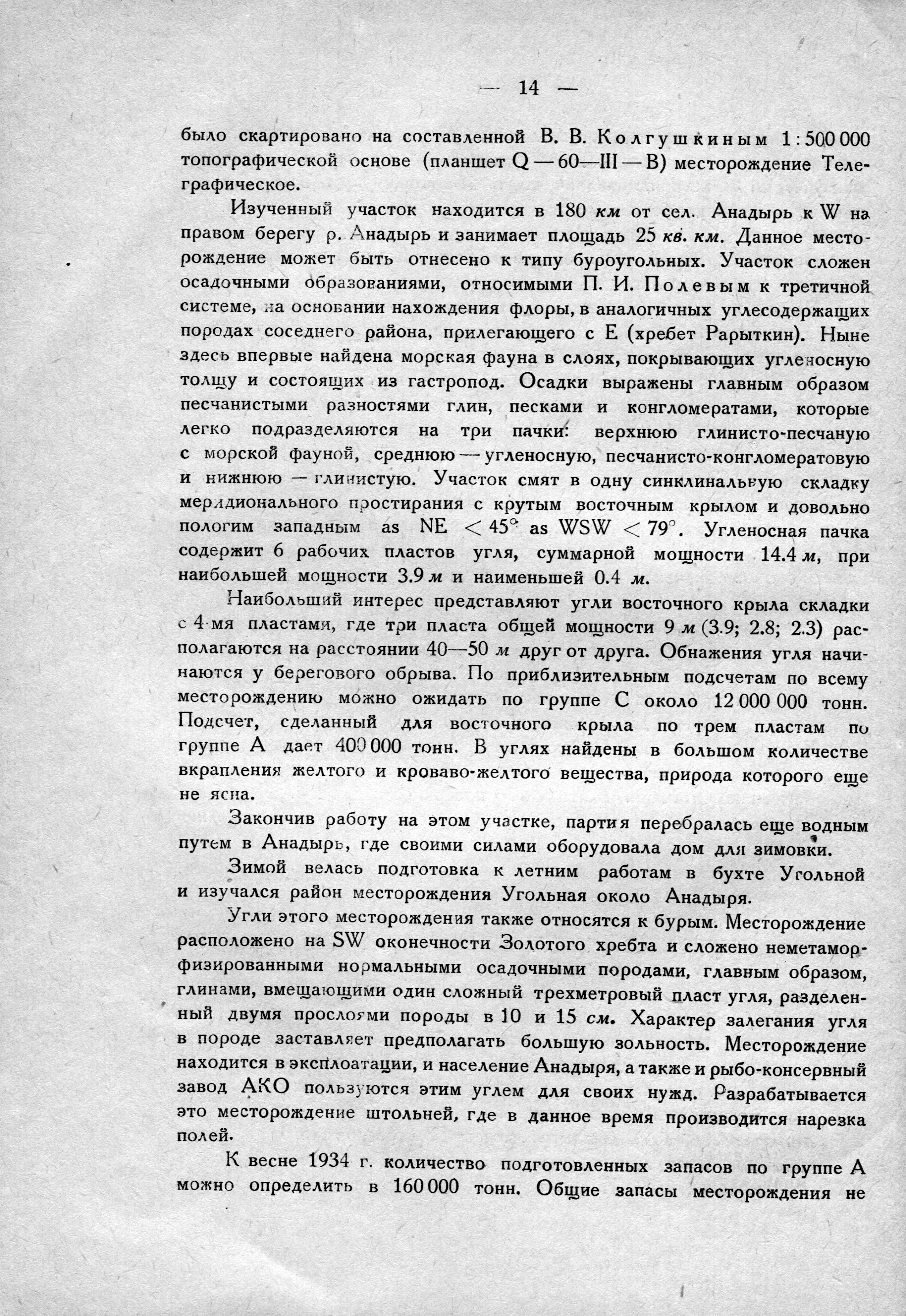 В. Колгушкин заснял угольные месторождения на мысе Телеграфическом (1:25 000 мензульная съемка) и в бухте Угольной (1:100 000 — глазомерная), и проделал с глазомерной съемкой маршрут через Коряцкий хребет бухты Угольной до Майна-Пыльхын.