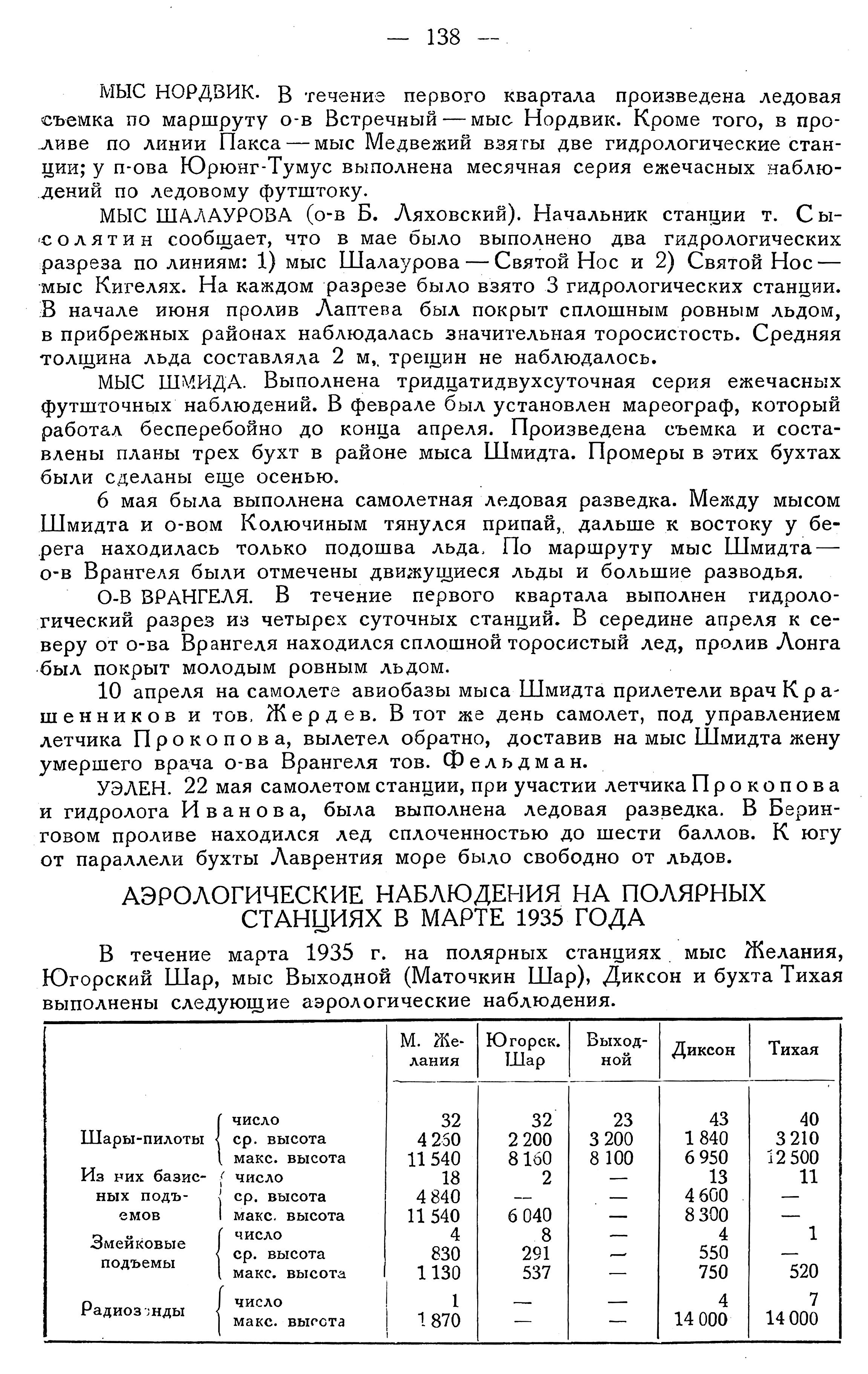 В течение марта 1935 г. на полярных станциях мыс Желания, Югорский Шар, мыс Выходной (Маточкин Шар), Диксон и бухта Тихая выполнены следующие аэрологические наблюдения.