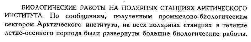 По сообщениям, полученным промыслово-биологическим сектором Арктического института, на всех полярных станциях в течение летне-осеннего периода были развернуты большие биологические работы.
