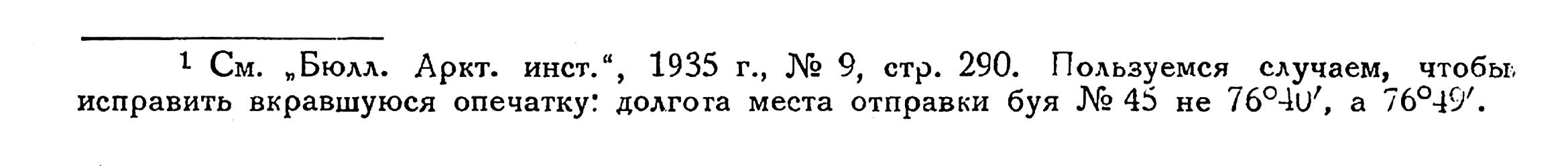 1) См. „Бюлл. Аркт. инст. ", 1935 г., № 9, стр. 290. Пользуемся случаем, чтобы, исправить вкравшуюся опечатку: долгота места отправки буя № 45 не 76°40', а 76°49'.