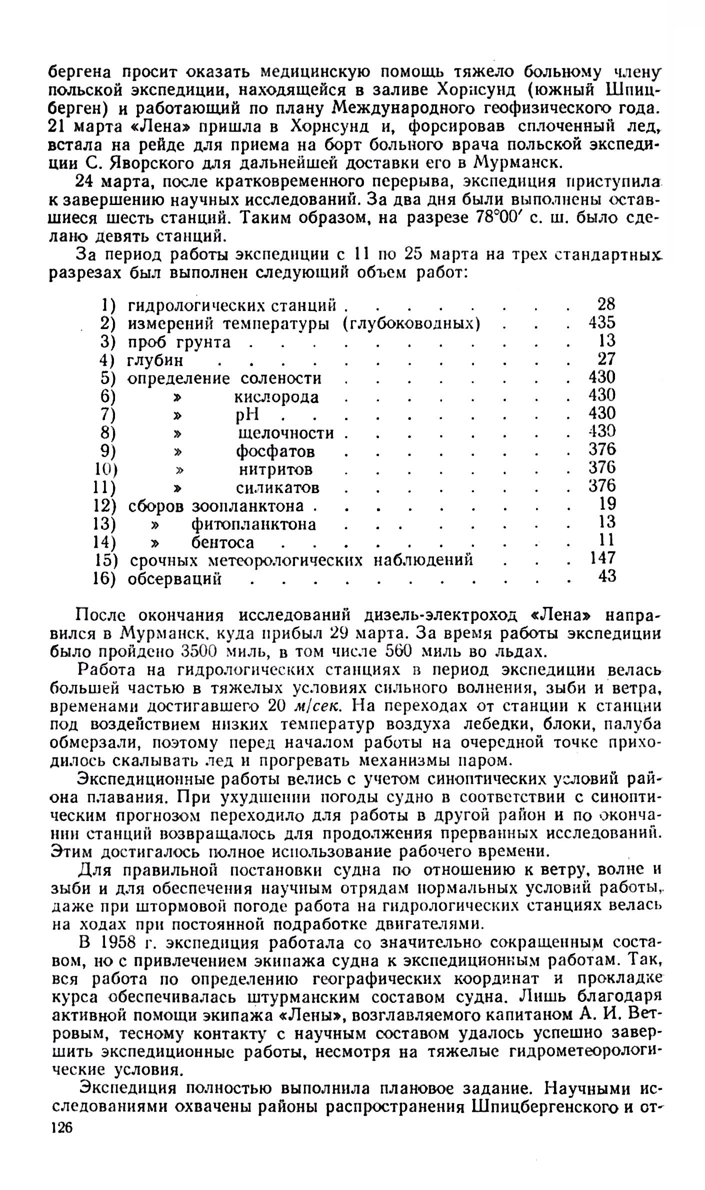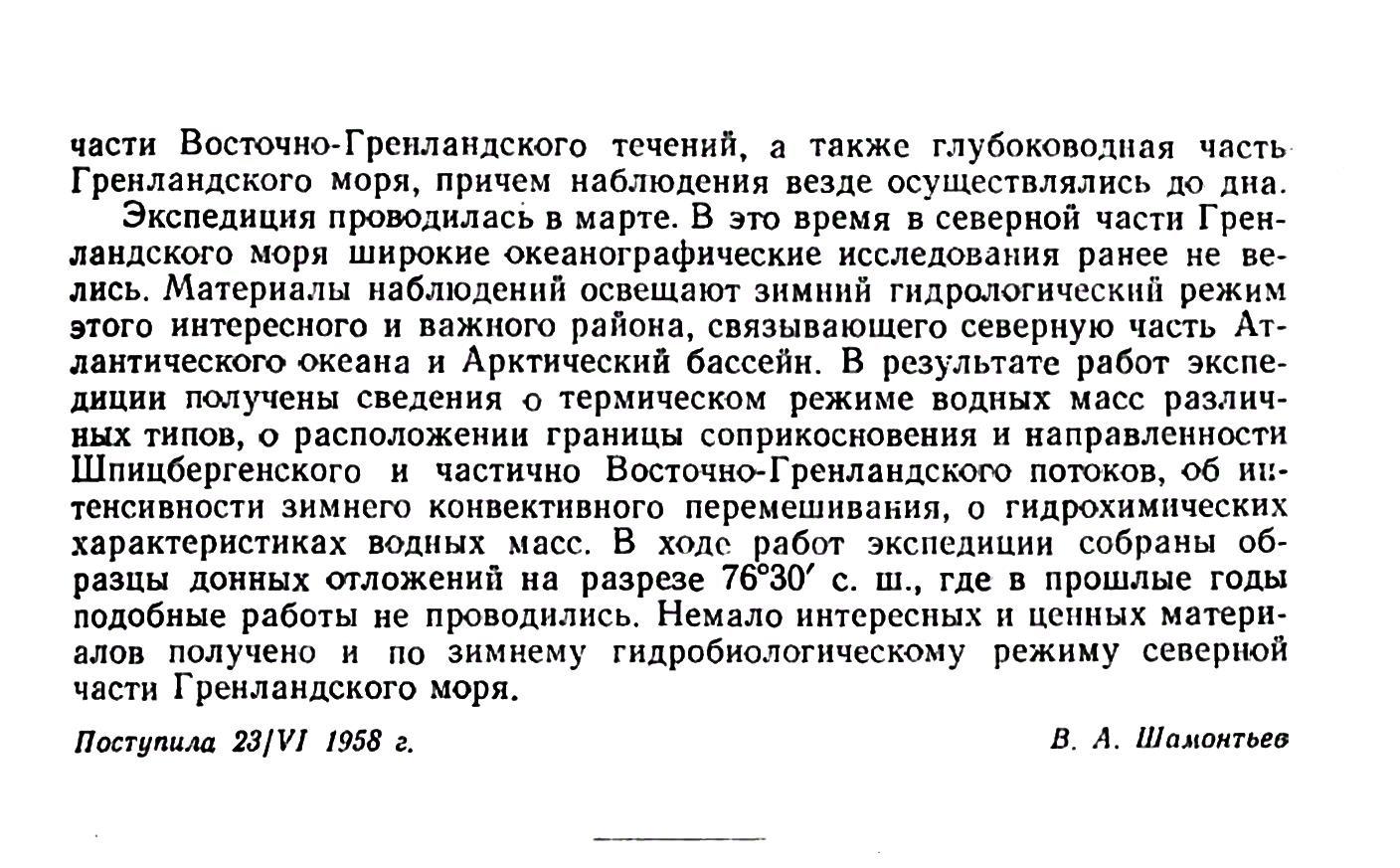 В марте 1958 г. Арктическим институтом проведена комплексная океанографическая экспедиция в северной части Гренландского моря на дизель-электроходе «Лена», организованная по программе Международного геофизического года. Эти работы явились продолжением регулярных исследований, выполнявшихся Арктическим институтом в Гренландском море в 1955 г. на л/р «Ф. Литке», в 1956 г. на дизель-электроходе «Обь», в 1957 г. — на дизель-электроходе «Лена». Если прошлые исследования Гренландского моря проводились эпизодически один раз в году и большей частью в летний или в осенний период, то в 1958 г. намечено осуществить четыре сезонные океанографические съемки: в марте, мае — июне, августе — сентябре и ноябре — декабре. Экспедиция на «Лене» явилась первым из указанных рейсов.
