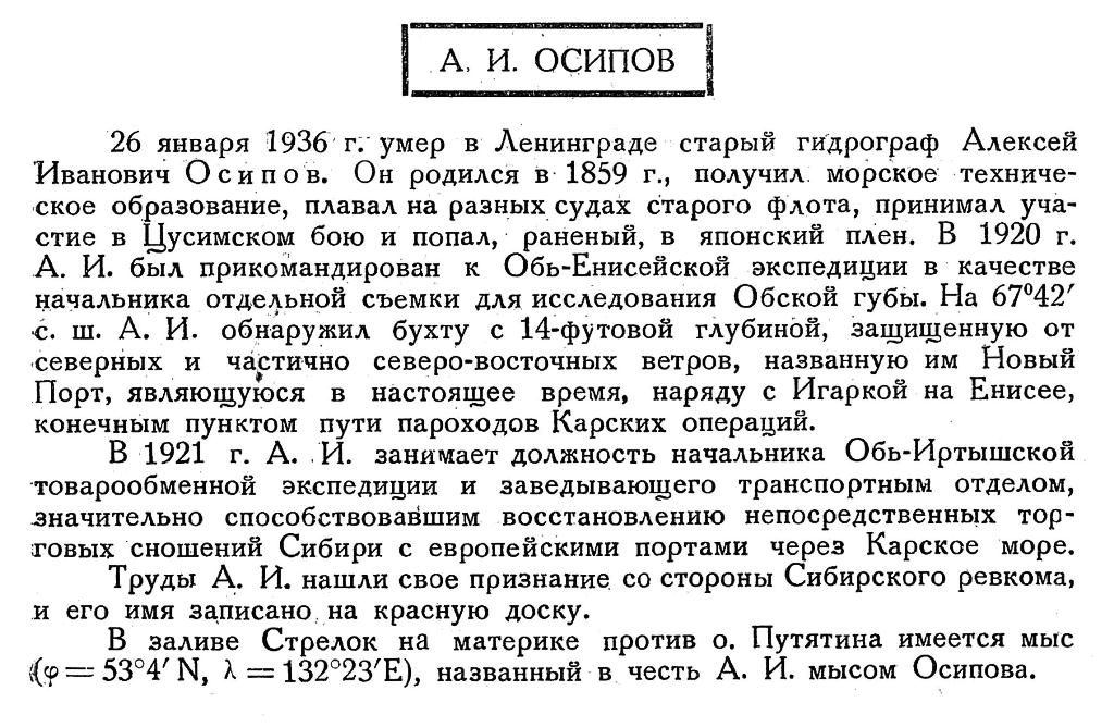 26 января 1936 г. умер в Ленинграде старый гидрограф Алексей Иванович Осипов. Он родился в 1859 г., получил морское техническое образование, плавал на разных судах старого флота, принимал участие в Цусимском бою и попал, раненый, в японский плен. В 1920 г. А. И. был прикомандирован к Обь-Енисейской экспедиции в качестве начальника отдельной съемки для исследования Обской губы. На 67°42' с. ш. А. И. обнаружил бухту с 14-футовой глубиной, защищенную от северных и частично северо-восточных ветров, названную им Новый Порт, являющуюся в настоящее время, наряду с Игаркой на Енисее, конечным пунктом пути пароходов Карских операций.