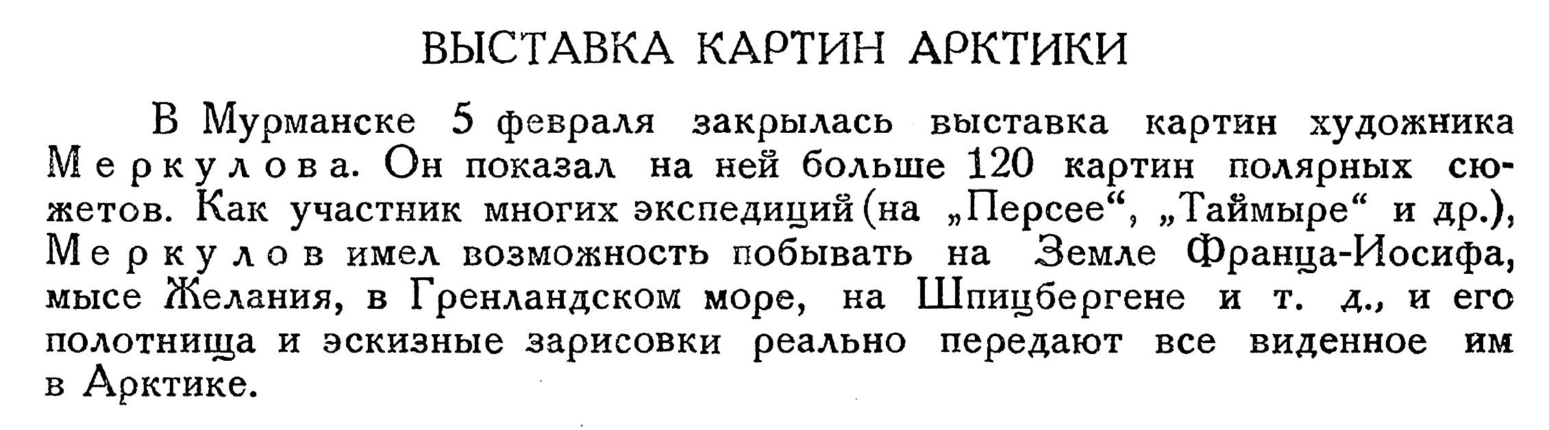 В Мурманске 5 февраля закрылась выставка картин художника Меркулова. Он показал на ней больше 120 картин полярных сюжетов. Как участник многих экспедиций (на „Персее“, „Таймыре" и др. ), Meркулов имел возможность побывать на Земле Франца-Иосифа, мысе Желания, в Гренландском море, на Шпицбергене и т. д., и его полотнища и эскизные зарисовки реально передают все виденное им в Арктике.
