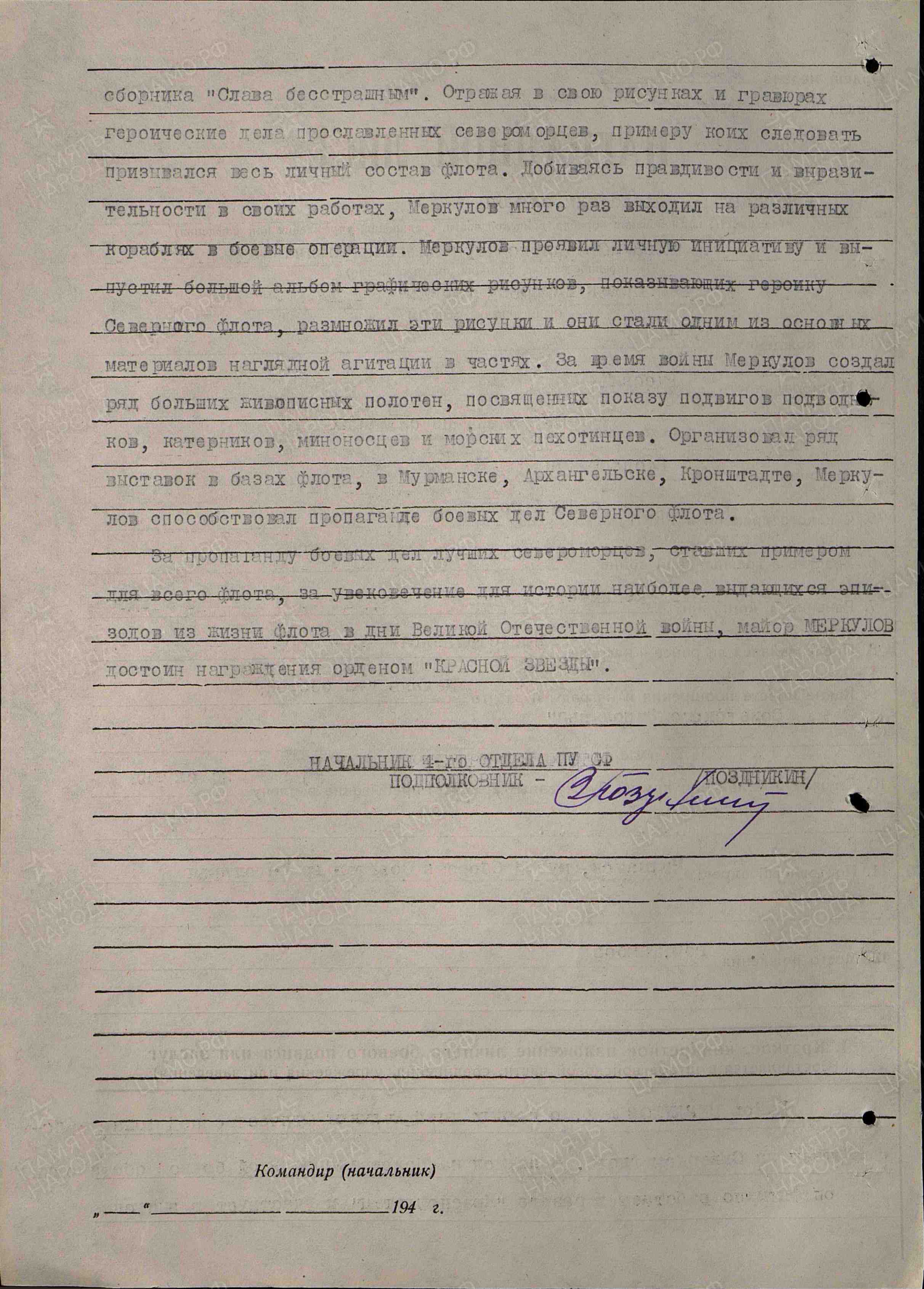 Меркулов Александр Александрович (1904, г. Тамбов – 1973), художник. Окончил Центр. курсы Ассоциации художников революции (1928). С 1918 – столяр, рабочий в совхозе, техник, в 1930-х – участник высокоширотных эксп. на судах «Персей» (1934), «Таймыр» (1936–1937), «Малыгин» (1938), во время кот. побывал на Нов. Земле, Шпицбергене, Земле Франца-Иосифа, в Гренландии, на Ян-Майене и др.; в 1940–1945 – штатный художник Политупр. СФ. Автор более 1500 картин, гравюр, рисунков, плакатов, в перв. очередь посвященных Северу, среди кот. наиболее известны картины «Ледяное безмолвие», «Земля Франца-Иосифа. Бухта Тихая», «Шпицберген. Советский рудник», «У пирса», «В поход», «К бою готовы», «Вернулись из похода подлодки», а также серия картин «Покоренная Арктика» (1950-е). Участник выставок «Индустрия социализма», «20 лет ВЛКСМ», «20 лет РККА» и мн. др. персональных выставок. Участник Вел. Отеч. войны, обороны Сов. Заполярья, Петсамо-Киркенесской наступательной операции, боевых походов кораблей СФ, боевых вылетов. Руководитель маскировки кораблей. Один из авторов сатирических плакатов «Таран» и «Окна «Полярной правды». Автор линогравюр, публиковавшихся в газ. «Краснофлотец», «Северная вахта», «В бой за Родину», «Полярная правда». Оформитель сборников «Слава бесстрашным», альбома «СФ в боях за Родину», серии графических зарисовок «Дорога в Киркенес – Норвегию», посвященной наступлению 1944. Автор персональной выставки 1944, побывавшей в Мурманске, Архангельске, Ваенге, Полярном, Кронштадте, кот. посетили более 300 тыс. чел. Перв. пред. обл. Союза сов. художников в г. Мурманске (1944). Заслуженный художник РФСР.