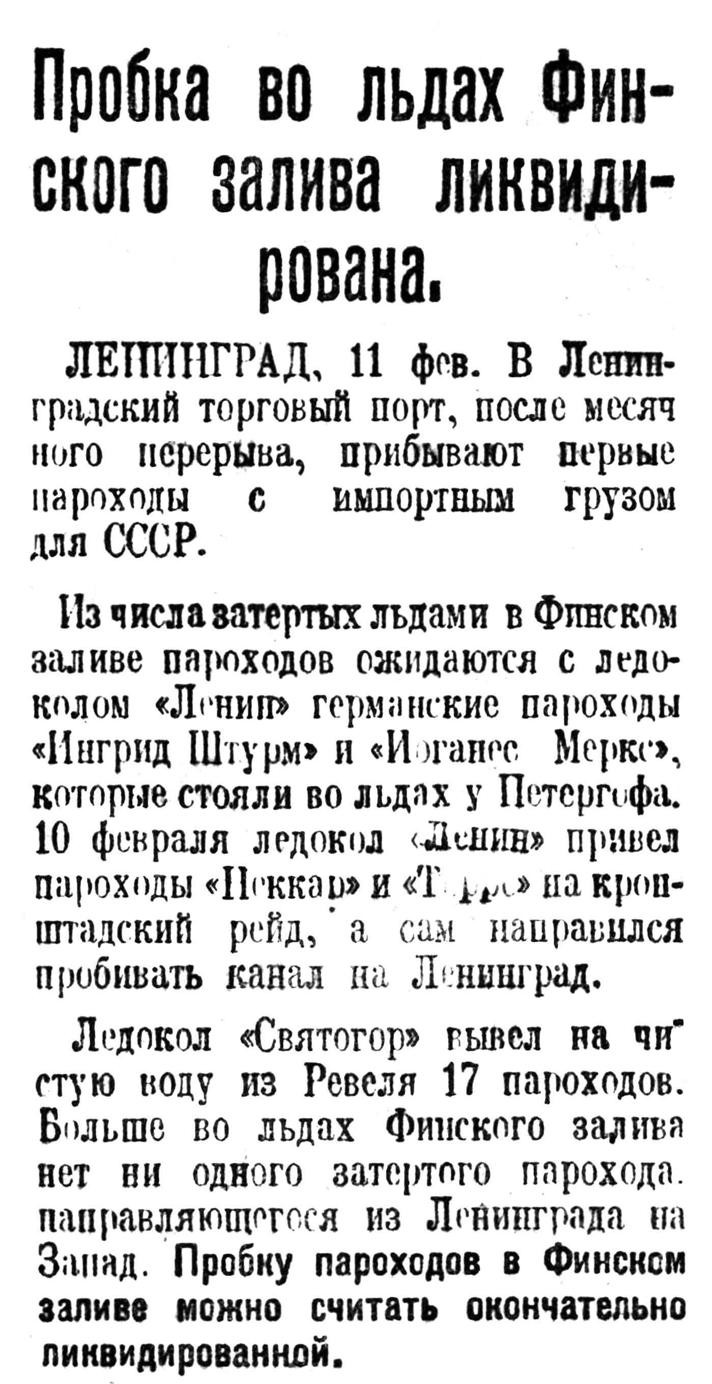 ЛЕНИНГРАД, 19 января. Наши ледоколы продолжают оказывать энергичную помощь пароходам, застрявшим в водах Финского залива. Ледоколы уже вывели в Ревель 11 пароходов.