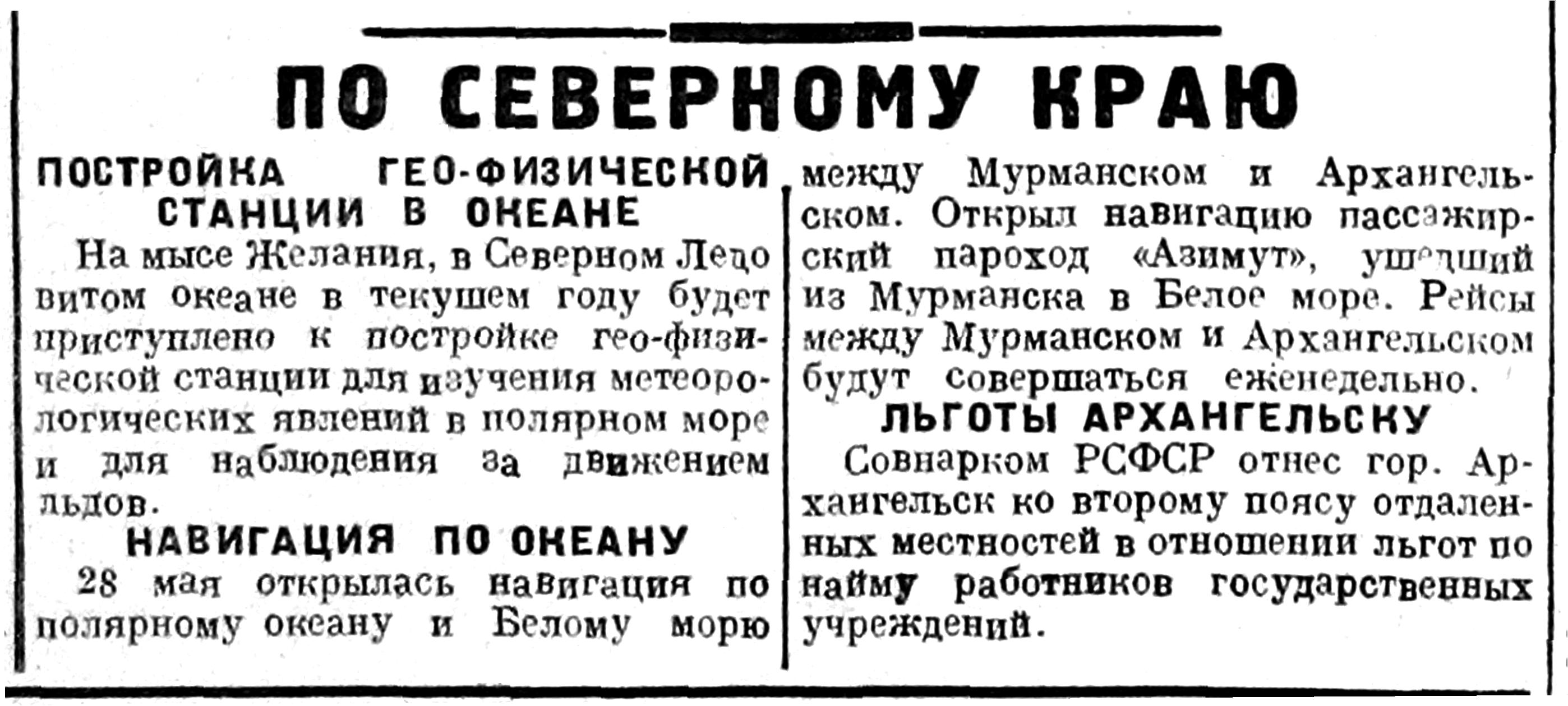 28 мая открылась навигация по полярному океану и Белому морю между Мурманском и Архангельском. Открыл навигацию пассажирский пароход «Азимут», ушедший из Мурманска в Белое море. Рейсы между Мурманском и Архангельском будут совершаться еженедельно.