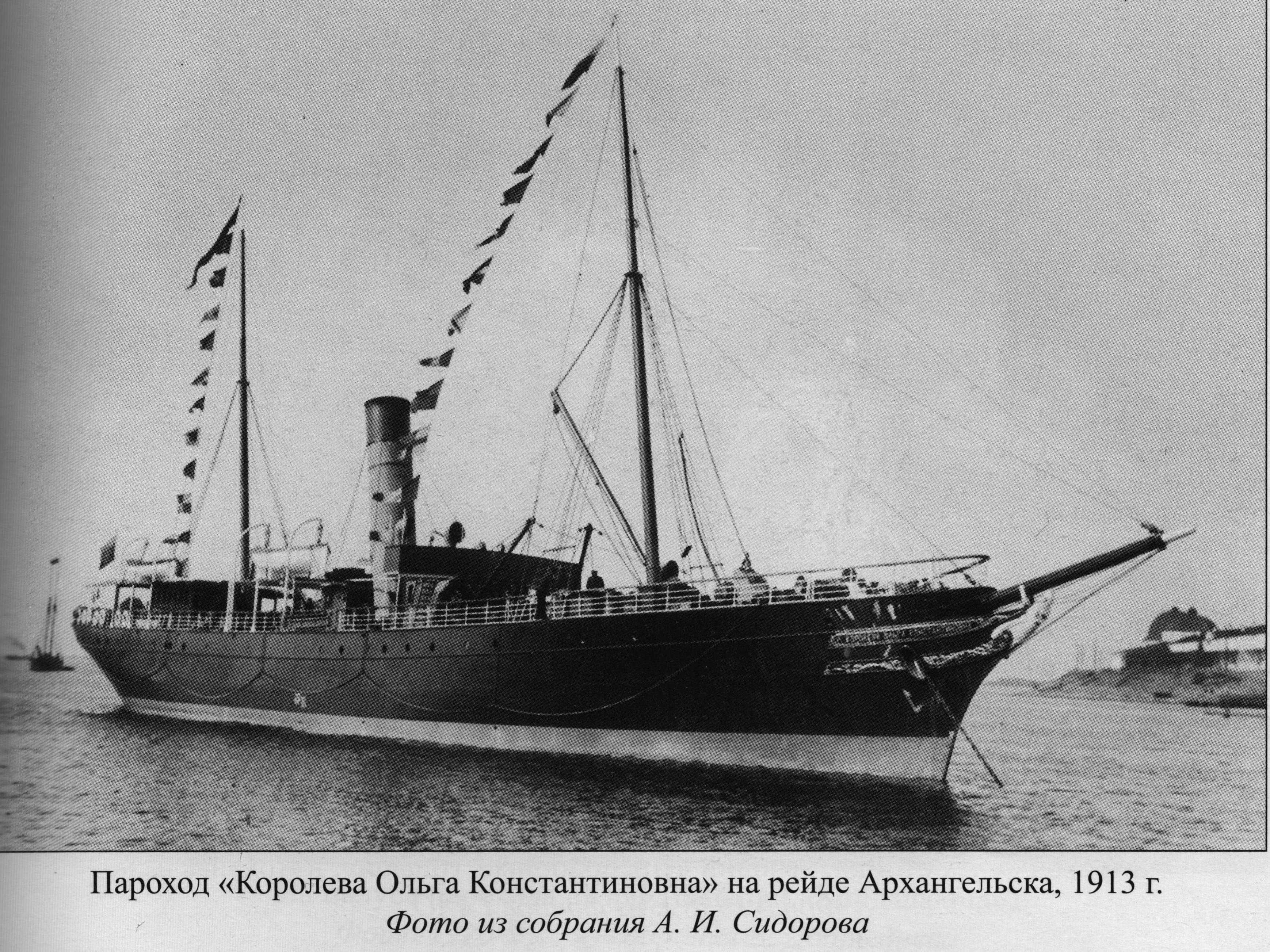 «...Благодаря пароходам в отдельных случаях навигацию удавалось продлить. Ломая тонкий лед железным корпусом, никак не приспособленным для ледового плавания, пароходы прокладывали путь поморским парусникам. Каждый из таких случаев был событием незаурядным. Вот что писали «Архангельские губернские ведомости» в 1902 г., когда из-за ранних холодов оказались прочно закованными в лед несколько десятков поморских судов и когда иностранные пароходы, во избежание подобной участи, ушли с полупустыми трюмами: «С 5-го на 6-е октября сего года 1902 года… лед стал на Северной Двине; народ уже ходил по разным направлениям по льду, перебираясь на левый берег Двины – в пригородные селения и обратно в Архангельск – на базар; в то же время пароход Мурманского Товарищества «Королева Ольга Константиновна», пробивая лед, вводил некоторые поморские суда в устье Двины и выводил другие в море, несмотря на Дирекции маяков и Белого моря, от 1 октября, о снятии флаг-баканов по устью и фарватерам реки Двины, несмотря на снятие Северо-Двинского плавучего маяка с места его стоянки».