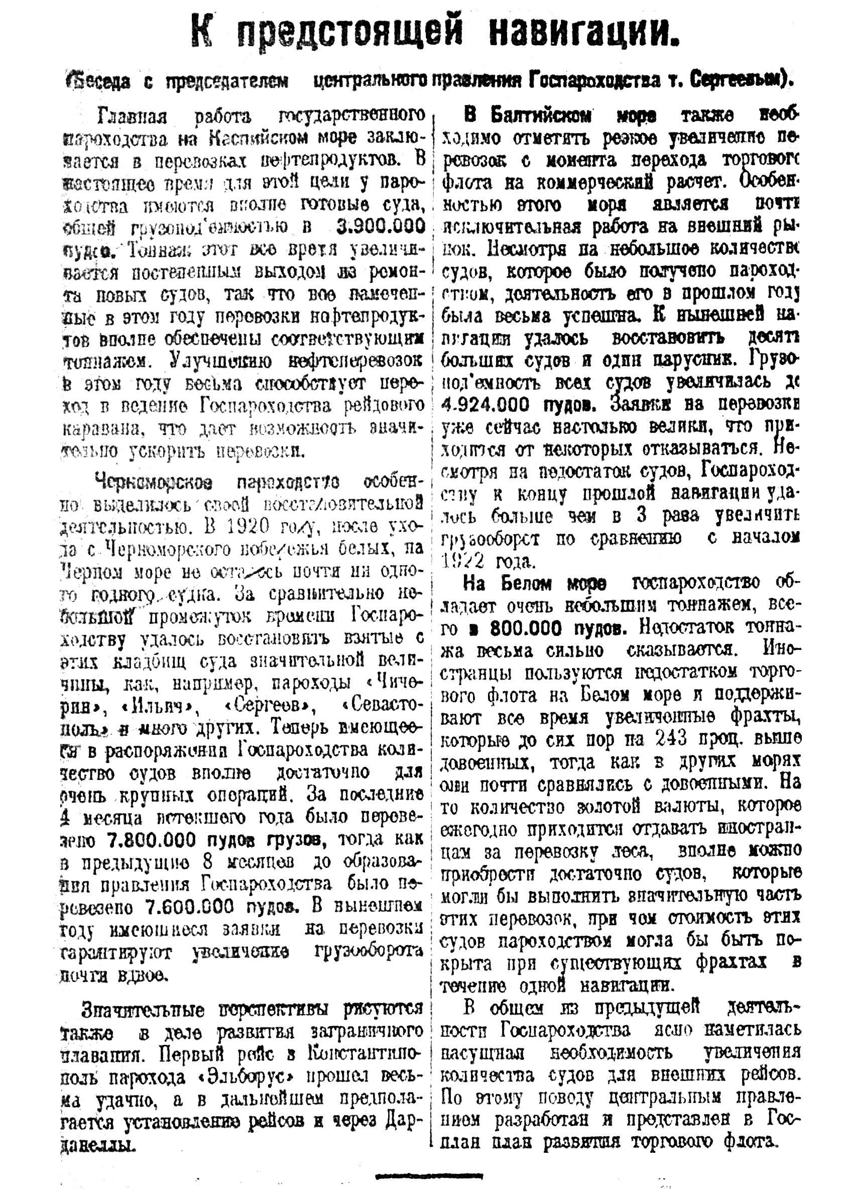 Черноморское пароходство особенно выделилось своей восстановительной деятельностью. В 1920 году, после ухода с Черноморского побережья белых, на Черном море не осталось почти ни одного годного судка. За сравнительно небольшой промежуток времени Госпароходству удалось восстановить взятые с этих кладбищ суда значительной величины, как, например, пароходы «Чичерин», «Ильич», «Сергеев», «Севастополь» в много других. Теперь имеющееся в распоряжении Госпароходства количество судов вполне достаточно для очень крупных операций. За последние 4 месяца истекшего года было перевезено 7.800.000 пудов грузов, тогда как в предыдущие 8 месяцев до образования правления Госпароходства было перевезено 7.600.000 пудов. В нынешнем году имеющиеся заявки на перевозки гарантируют увеличение грузооборота почти вдвое.
