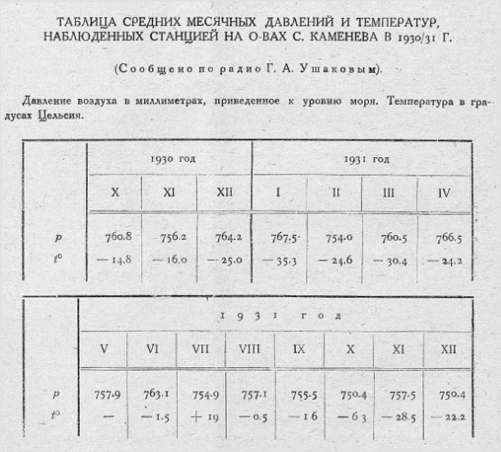 ТАБЛИЦА СРЕДНИХ МЕСЯЧНЫХ ДАВЛЕНИЙ И ТЕМПЕРАТУР, НАБЛЮДЕННЫХ СТАНЦИЕЙ НА О-ВАХ С. КАМЕНЕВА В 1930/31 Г.