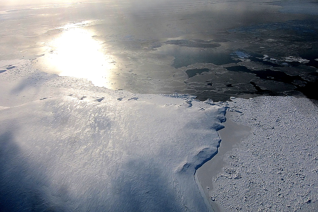 Перед самым основанием мыска, где стоит знак приличная расщелина. Сейчас она засыпана снегом и я могу вплотную подойти к небольшой площадке. Рядом со мной в тишине солнечного дня дышит море покрытое местами ледком, местами открытой водой и нагромождениями торосов.