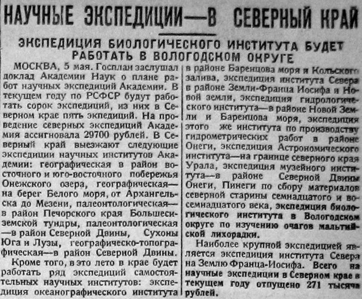 Кроме того, в это лето в крае будет работать ряд экспедиций самостоятельных научных институтов: экспедиция океанографического института в районе Баренцова моря я Кольского залива, экспедиция института Севера в районе Земли-Франца Иосифа и Новой земли, экспедиция гидрологического института — в районе Новой Земли и Баренцова моря, экспедиция этого же института по производству гидрометрических работ в районе Онеги, экспедиция Астрономического института — на границе северного края Урала, экспедиция музейного института — в районе Северной Двины Онеги, Пинеги по сбору материалов северной старины семнадцатого и восемнадцатого века, экспедиция биологического институте в Вологодском округе по изучению очагов мальтийской лихорадки.