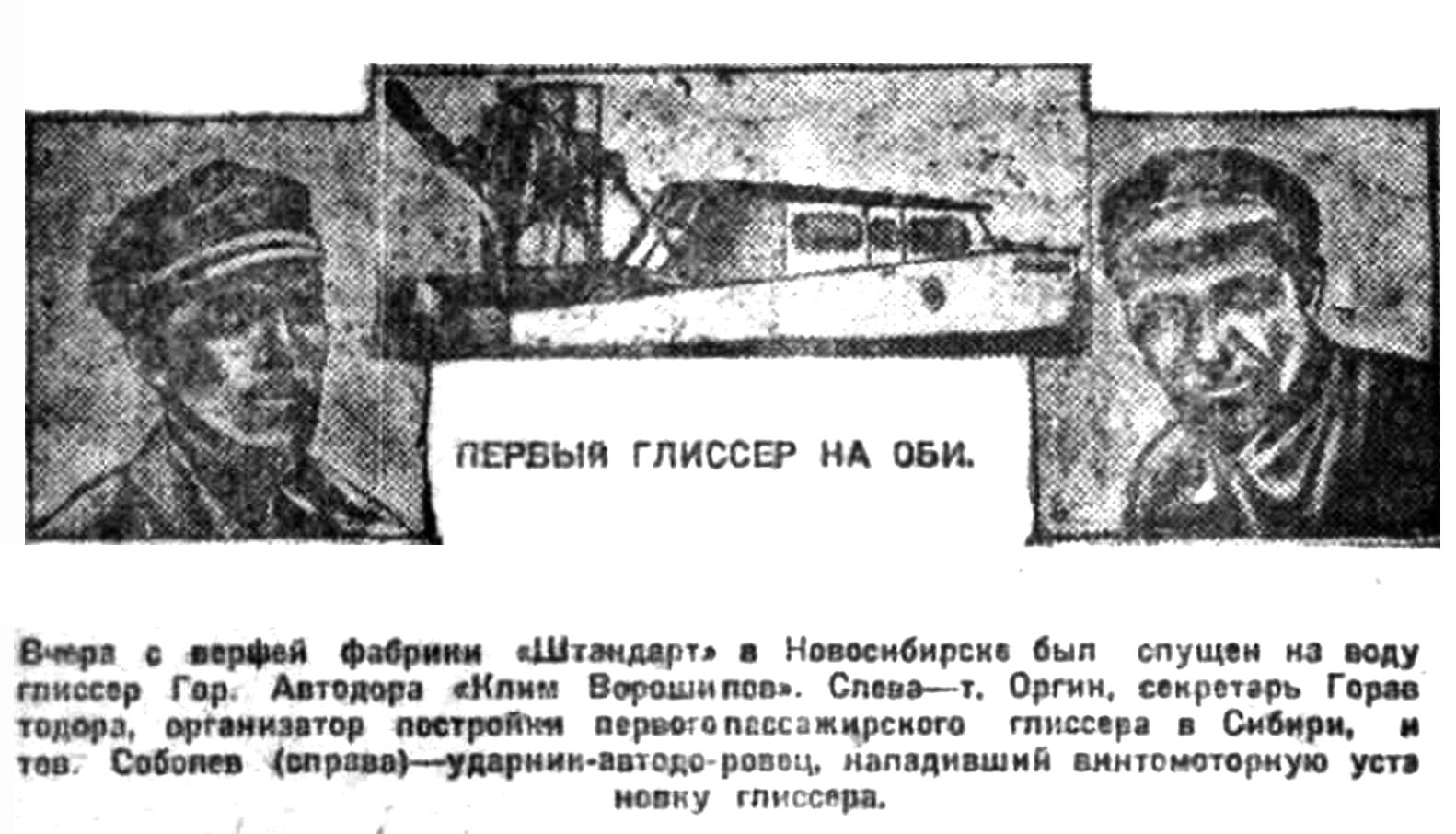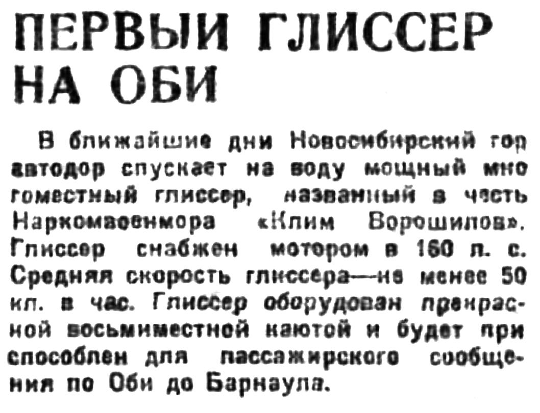 В ближайшие дни Новосибирский горавтодор спускает на воду мощный многоместный глиссер, названный в честь Наркомвоенмора "Клим Ворошилов". Глиссер снабжен мотором в 160 п. с. Средняя скорость глиссера — не менее 50 кл. в час. Глиссер оборудован прекрасной восьмиместной каютой и будет приспособлен для пассажирского сообщения по Оби до Барнаула.