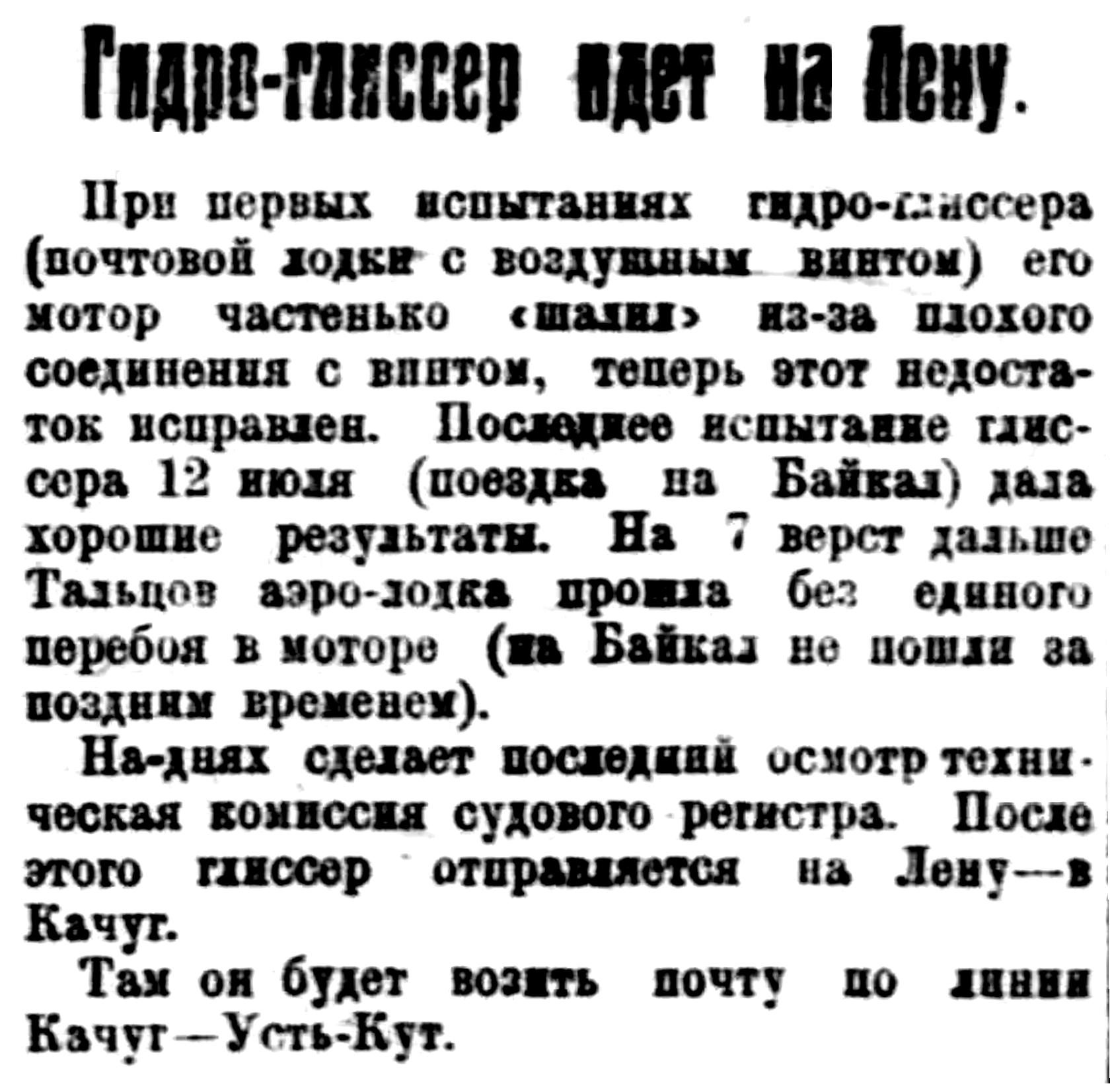 При первых испытаниях гидро-глиссера (почтовой лодки с воздушным винтом) его мотор частенько "шалил" из-за плохого соединения с винтом, теперь этот недостаток исправлен. Последнее испытание глиссера 12 июля (поездка на Байкал) дала хорошие результаты. На 7 верст дальше Тальцов аэро-лодка прошла без единого перебоя в моторе (на Байкал не пошли за поздним временем).
