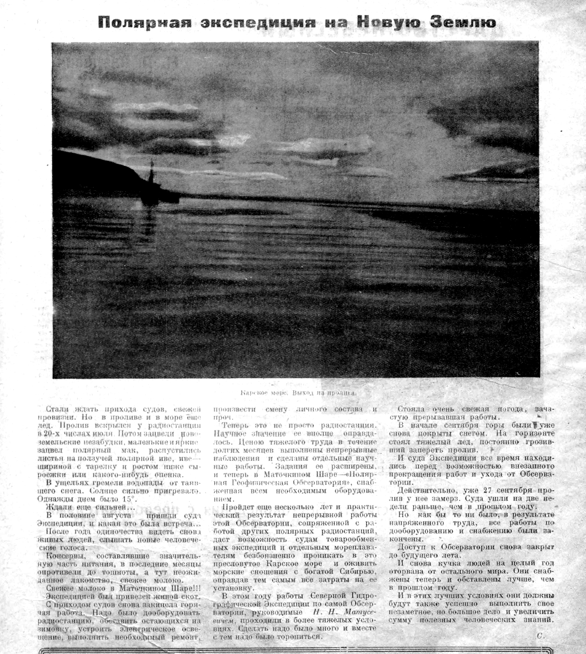 Велико значение Обсерватории. Маточкин Шар как раз в сфере воздушных течений, идущих с полюса. Кому же как не обсерватории на 75° улавливать малейшие атмосферные отклонения, еще мало изученные.