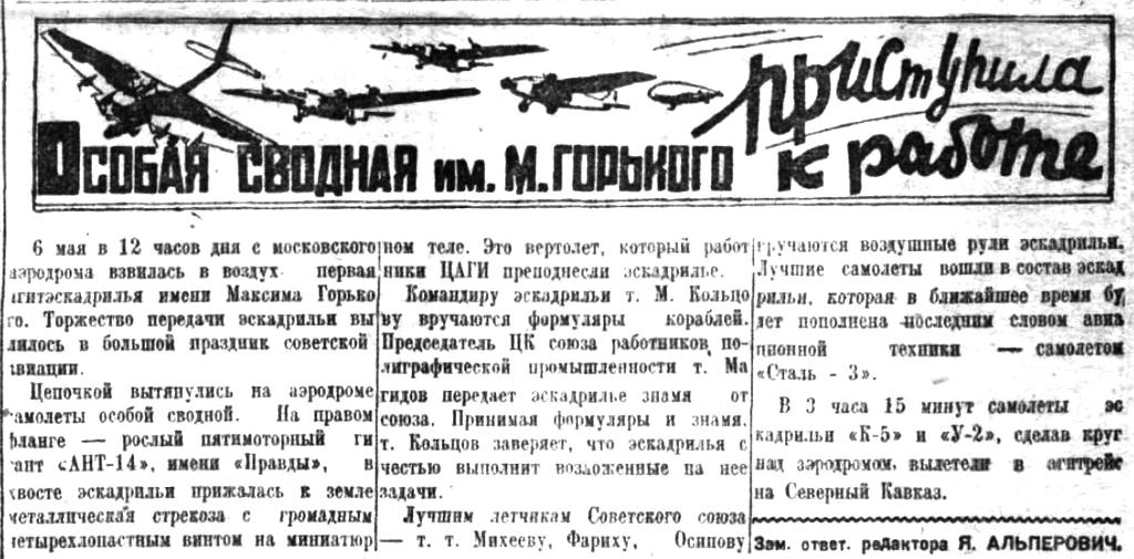 «В нашей стране особенно чтут мужество. Ведь та работа, которую мы произвели и производим, была бы немыслима без упорства и смелости. Могу заверить, что в нашей стране с большой симпатией следили за всеми перелетами Линдберга. У нас его имя так же хорошо известно, как и у него на родине. Мы рады прилету его и его смелой супруги—помощницы в трудной воздушной работе. Желаю им такого же удачного продолжения перелета по CСCP и самых приятных впечатлений о Советском союзе».