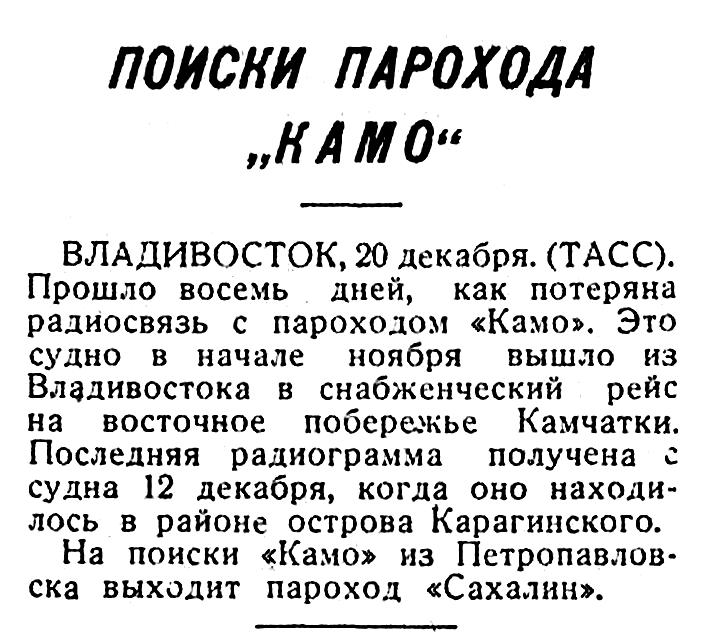 ПЕТРОПАВЛОВСК-НА-КАМЧАТКЕ, 3 января. (По телегр. от соб. корр.). Пароход «Сахалин» доставил сюда команду и пассажиров погибшего парохода «Камо» (см. «Известия» от 26 декабря 1936 г.) Вот как они рисуют картину гибели парохода.