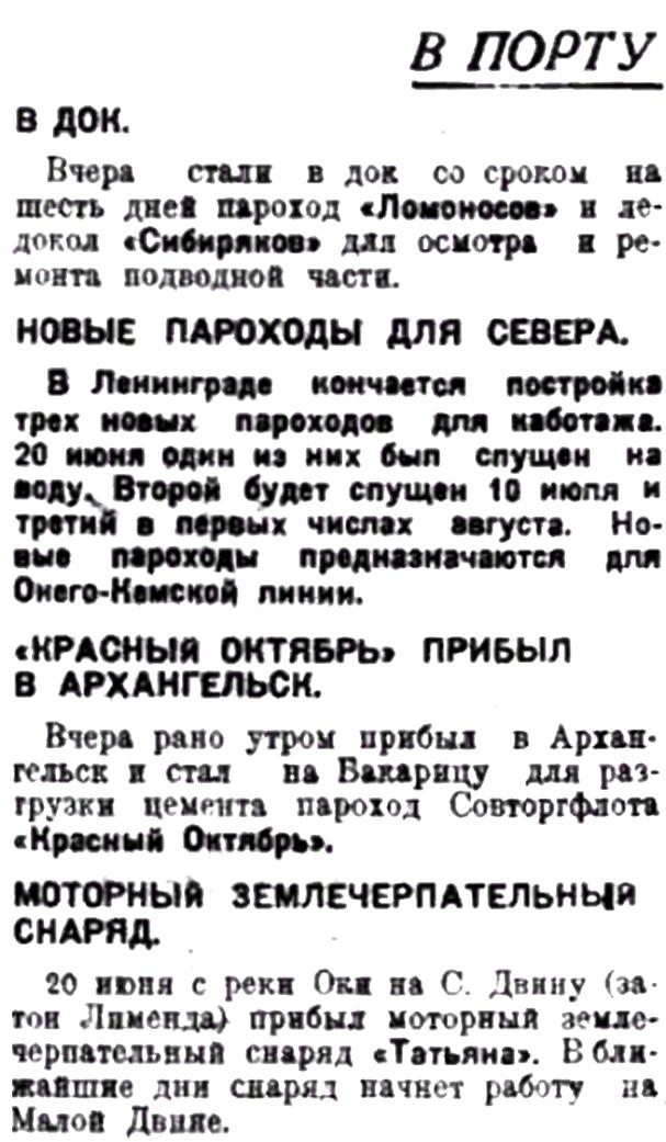 Вчера днем по Кандалакшской линии вышел срочным рейсом пароход "Пеша". С грузом вышел в "Онегу" пароход Совторгфлота "Профсоюз". В Мезень вышел пароход "Умба" первым пробным рейсом, после десятимесячного ремонта. 30 июня прибыл из Онеги с грузом металлического лома пароход "Чижа»". "Соловки" 30 июня пришел срочным рейсом из Онеги.