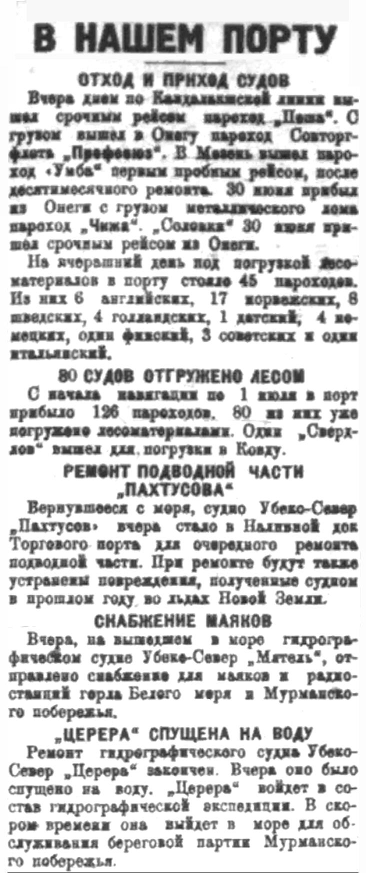 Вчера днем по Кандалакшской линии вышел срочным рейсом пароход "Пеша". С грузом вышел в "Онегу" пароход Совторгфлота "Профсоюз". В Мезень вышел пароход "Умба" первым пробным рейсом, после десятимесячного ремонта. 30 июня прибыл из Онеги с грузом металлического лома пароход "Чижа»". "Соловки" 30 июня пришел срочным рейсом из Онеги.