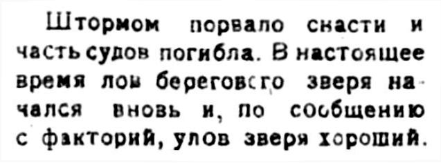 Штормом порвало снасти и часть судов погибла. В настоящее время лов берегового зверя начался вновь и, по сообщению с факторий, улов зверя хороший.
