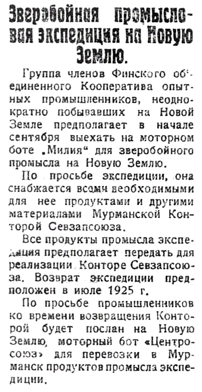 По просьбе промышленников ко времени возвращения Конторой будет послан на Новую Землю, моторный бот «Центросоюз» для перевозки в Мурманск продуктов промысла экспедиции.