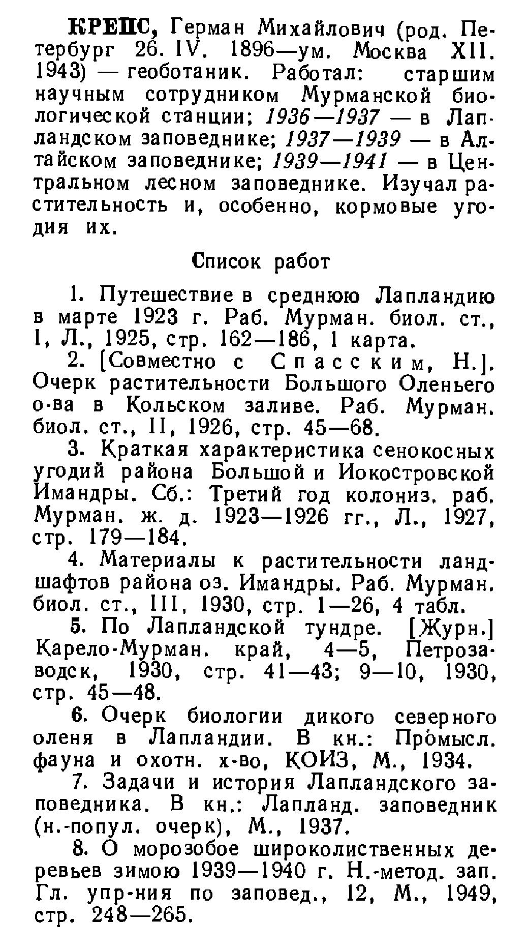КРЕПС, Герман Михайлович (род. Петербург 26. IV. 1896—ум. Москва XII. 1943 *) — геоботаник. Работал: старшим научным сотрудником Мурманской биологической станции; 1936—1937 — в Лапландском заповеднике; 1937—1939 — в Алтайском заповеднике; 1939—1941 — в Центральном лесном заповеднике. Изучал растительность и, особенно, кормовые угодия их.
