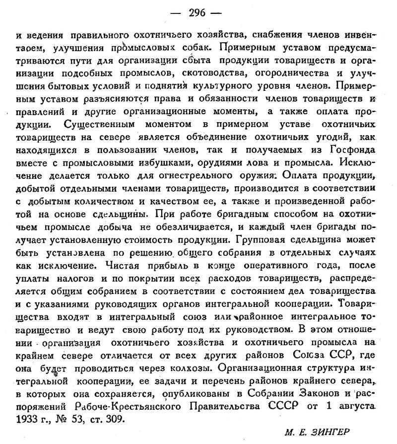 ПРОИЗВОДСТВЕННЫЕ ТОВАРИЩЕСТВА ОХОТНИКОВ НА КРАЙНЕМ СЕВЕРЕ. В „Бюллетене" Народного Комиссариата земледелия РСФСР 1933 г., №11/12, опубликован примерный устав Производственного товарищества охотников на крайнем севере, утвержденный Коллегией НКЗ РСФСР 5 апреля 1933 г. Этот устав разработан Союзохотцентром и согласован с Комитетом севера при ВЦИК. После изложения целей и задач товариществ, уставом указываются пути объединения батраков, бедняков и середняков и способы пользования промысловыми угодьями и ведения правильного охотничьего хозяйства, снабжения членов инвентарём, улучшения промысловых собак. Примерным уставом предусматриваются пути для организации сбыта продукции товариществ и организации подсобных промыслов, скотоводства, огородничества и улучшения бытовых условий и поднятия культурного уровня членов. Примерным уставом разъясняются права и обязанности членов товариществ и правлений и другие организационные моменты, а также оплата продукции. Существенным моментом в примерном уставе охотничьих товариществ на севере является объединение охотничьих угодий, как находящихся в пользовании членов, так и получаемых из Госфонда вместе с промысловыми избушками, орудиями лова и промысла. Исключение делается только для огнестрельного оружия. Оплата продукции, добытой отдельными членами товариществ, производится в соответствии с добытым количеством и качеством ее, а также и произведенной работой на основе сдельщины. При работе бригадным способом на охотничьем промысле добыча не обезличивается, и каждый член бригады получает установленную стоимость продукции. Групповая сдельщина может быть установлена по решению, общего собрания в отдельных случаях как исключение. Чистая прибыль в конце оперативного года, после уплаты налогов и по покрытии всех расходов товариществ, распределяется общим собранием в соответствии с состоянием дел товарищества и с указаниями руководящих органов интегральной кооперации. Товарищества входят в интегральный союз или районное интегральное товарищество и ведут свою работу под их руководством. В этом отношении организация охотничьего хозяйства и охотничьего промысла на крайнем севере отличается от всех других районов Союза ССР, где она будет проводиться через колхозы. Организационная структура интегральной кооперации, ее задачи и перечень районов крайнего севера, в которых она сохраняется, опубликованы в Собрании Законов и распоряжений Рабоче-Крестьянского Правительства СССР от 1 августа 1933 г., № 53, ст. 309.