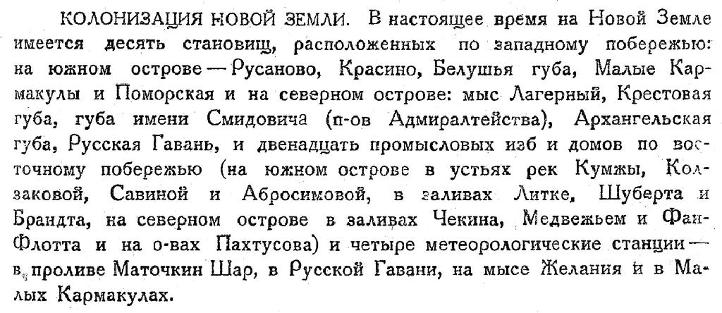 КОЛОНИЗАЦИЯ НОВОЙ ЗЕМЛИ. В настоящее время на Новой Земле имеется десять становищ, расположенных по западному побережью: ка южном острове — Русаново, Красино, Белушья губа, Малые Кармакулы и Поморская и на северном острове: мыс Лагерный, Крестовая губа, губа имени Смидовича (п-ов Адмиралтейства), Архангельская губа, Русская Гавань, и двенадцать промысловых изб и домов по восточному побережью (на южном острове в устьях рек Кумжы, Колзаковой, Савиной и Абросимовой, в заливах Литке, Шуберта и Брандта, на северном острове в заливах Чекина, Медвежьем и Фан-Флотта и на о-вах Пахтусова) и четыре метеорологические станции — в проливе Маточкин Шар, в Русской Гавани, на мысе Желания к в Малых Кармакулах.