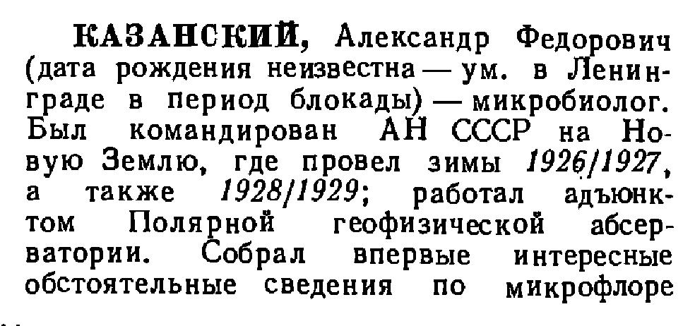 КАЗАНСКИЙ, Александр Федорович (дата рождения неизвестна — ум. в Ленинграде в период блокады) — микробиолог. Был командирован АН СССР на Новую Землю, где провел зимы 1926/1927, а также 1928/1929; работал адъюнктом Полярной геофизической обсерватории. Собрал впервые интересные обстоятельные сведения по микрофлоре почвы, воздуха и воды Арктики (бедность воздуха микроорганизмами, особенно в зимнее время, при одновременном наличии почвообразовательных процессов, связанных с деятельностью микроорганизмов, несмотря на их крайнюю замедленность). К. собрал также гербарий (в частности лишайников и мхов) и проводил регулярные фенологические наблюдения.