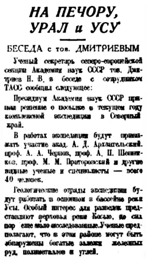 Ученый секретарь северо-европейской секции Академии наук СССР тов. Дмитриев Н. В. в беседе с сотрудником ТАСС сообщил следующее: