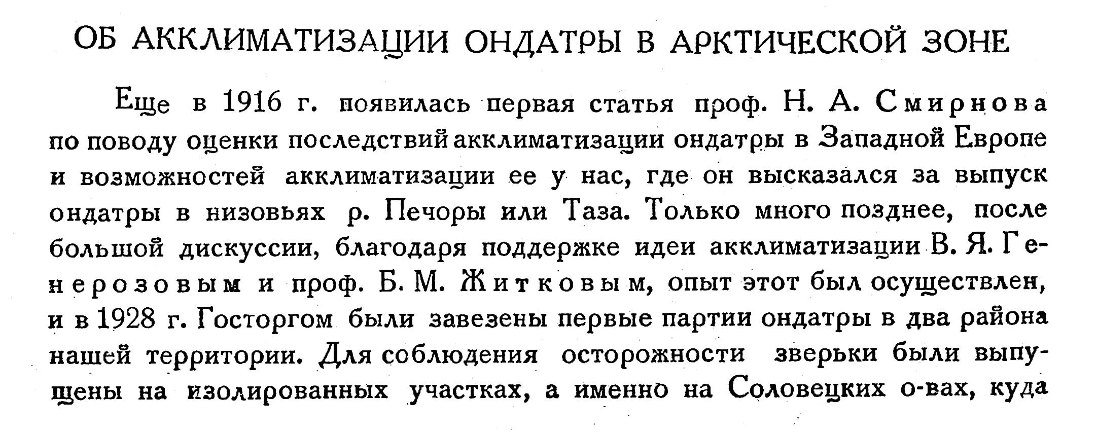 Еще в 1916 г. появилась первая статья проф. Н. А. Смирнова по поводу оценки последствий акклиматизации ондатры в Западной Европе и возможностей акклиматизации ее у нас, где он высказался за выпуск ондатры в низовьях р. Печоры или Таза. Только много позднее, после большой дискуссии, благодаря поддержке идеи акклиматизации В. Я. Генерозовым и проф. Б. М. Житковым, опыт этот был осуществлен, и в 1928 г. Госторгом были завезены первые партии ондатры в два района нашей территории. Для соблюдения осторожности зверьки были выпущены на изолированных участках, а именно на Соловецких о-вах, куда их доставили из Финляндии, и на о-в Карагинский, что у северного конца Камчатки, из Канады.