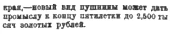 В виду того, что ондатра (мускусная крыса) вполне акклиматизировалась в крае и размножилась в достаточной мере, Главпушниной решено с будущего года начать охоту этого зверька. Уже вынесено постановление об отстреле 20.000 штук.