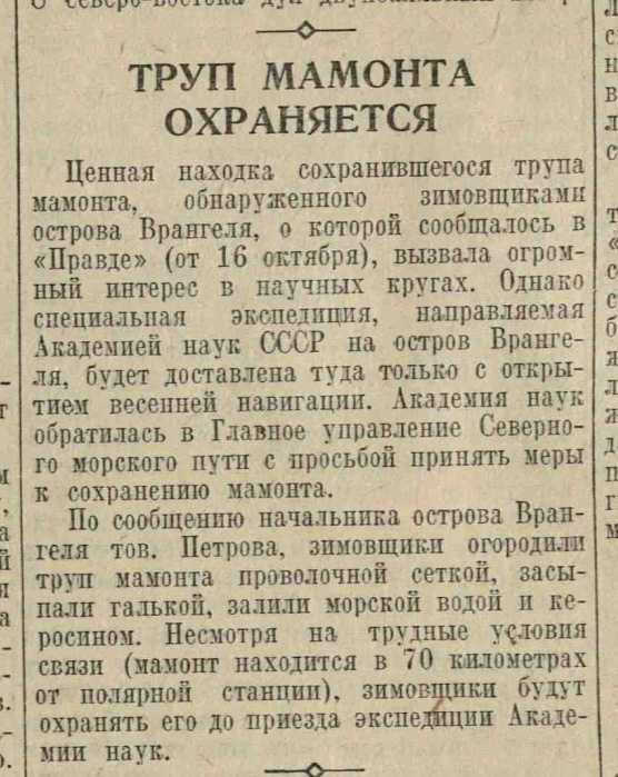 Как известно, кости мамонта, характерного млекопитающего четвертичного периода, встречаются в разных местностях Северной Европы и Азии, а в вечномерзлой почве Сибири время от времени находят целые трупы этих животных, сохранившиеся в течение 20—30 тысяч лет. Но до сих пор еще ни разу не был найден труп взрослого животного, неповрежденный, с мясом, кожей и шерстью. Это объяснялось тем, что при слабой населенности севера Сибири в старое время проходили целые месяцы, пока известие о находке трупа доходило до столицы, пока Академия Наук снаряжала экспедицию и последняя прибывала на место нахождения трупа, где находила уже, конечно, только остатки его, уцелевшие от хищных животных и птиц, от размыва водой и от перемен погоды. Поэтому полных сведений о наружном виде мамонта, образе его жизни, причинах гибели животного, условиях сохранения его трупа наука до сих пор не имеет, и каждая новая находка, которая дает