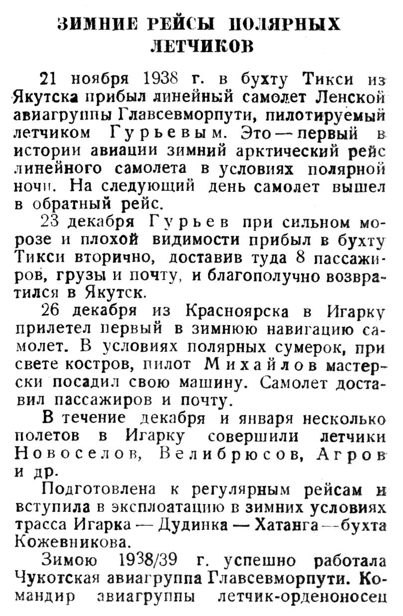 21 ноября 1938 г. в бухту Тикси из Якутска прибыл линейный самолет Ленской авиагруппы Главсевморпути, пилотируемый летчиком Гурьевым. Это — первый в истории авиации зимний арктический рейс линейного самолета в условиях полярной ночи. На следующий день самолет вышел в обратный рейс.