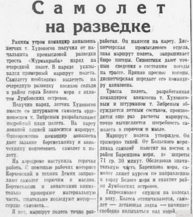 Нисколько дней назад архангельский отряд гражданской авиации получил первый четырехмоторный самолет «Г-2», предназначенный для доставки рыбы и других грузов из Заполярья в Архангельск.