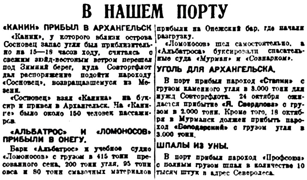 Вышел в Мезень несрочным рейсом пароход "Сосновец" и на рыбный промысел тральщики Севгосрыбтреста № 24 "Щука" и № 28 "Камбала". Барк "Альбатрос" кончает погрузку.