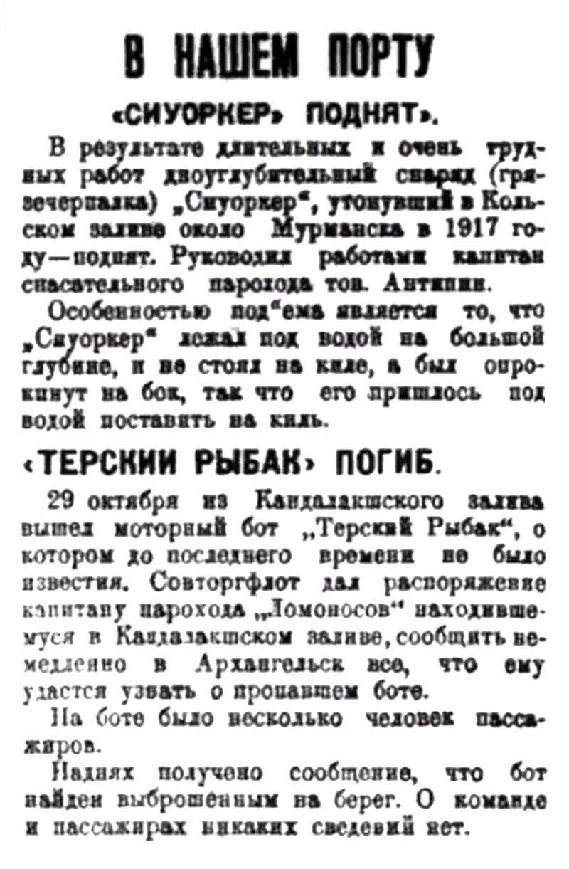 В результате длительных и очень трудных работ дноуглубительный снаряд (грязечерпалка) "Сиуоркер", утонувший в Кольском заливе около Мурманска в 1917 году — поднят. Руководил работами капитан спасательного парохода тов. Антипин.