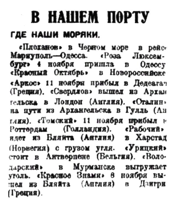 "Плеханов" в Черном море в рейсе Мариуполь — Одесса. «Роза Люксембург» 4 ноября пришла в Одессу. "Красный Октябрь" в Новороссийске "Аркос" 11 ноября прибыл в Дедеагач (Греция). "Свердлов" вышел из Архангельска в Лондон (Англия). "Сталин" на пути из Архангельска в Гулль (Англия). "Томский" 11 ноября прибыл в Роттердам (Голландия). "Рабочий" идет из Бляйта (Англия) в Харстад (Норвегия) с грузом угля. "Урицкий" стоит в Антверпене (Бельгия). "Володарский" в Мурманске выгружает уголь. "Красное Знамя" 8 ноября вышел из Бляйта (Англия) в Дзигри (Греция).