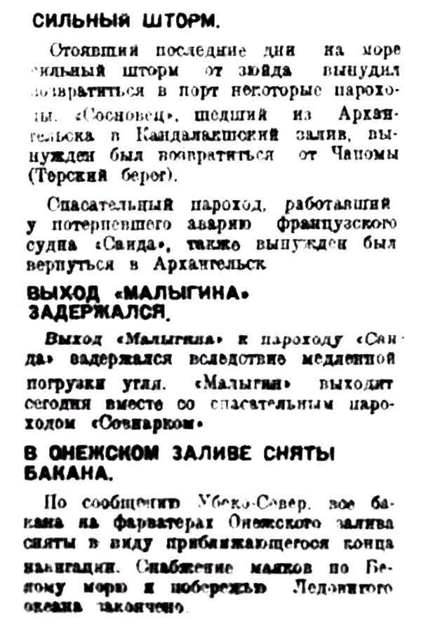 Стоявший последние дни на море сильный шторм от зюйда вынудил возвратиться в порт некоторые пароходы. "Сосновец", шедший из Архангельска в Кандалакшский залив, вынужден был возвратиться от Чапомы (Терский берег).