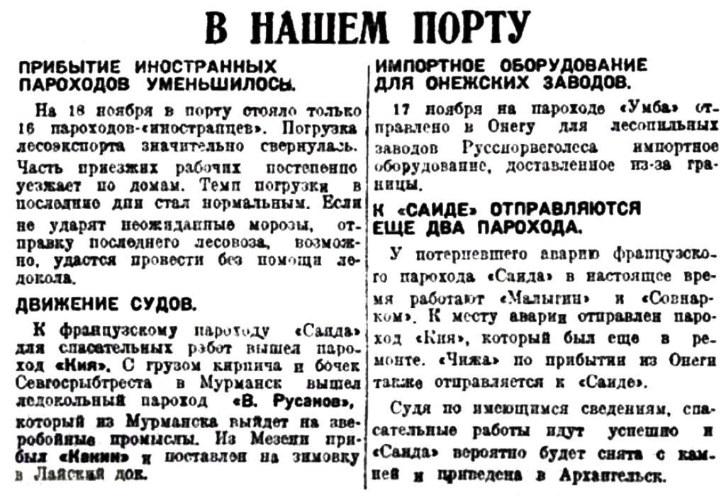 10 ноября возвратился с моря пароход "Мурман", работавший по спасению французского парохода "Саида", налетевшего с грузом леса на камни у Терского берега. У "Саиды" остался пароход "Совнарком". Работе в сильной степени мешают штормы.