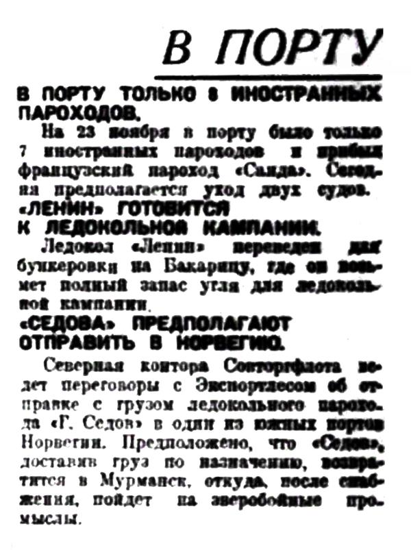 Северная контора Совторгфлота ведет переговоры с Экспортлесом об отправке с грузом ледокольного парохода "Г. Седов" в один из южных портов Норвегии. Предположено, что "Седов", доставив груз по назначению, возвратится в Мурманск, откуда, после снабжения, пойдет на зверобойный промыслы.
