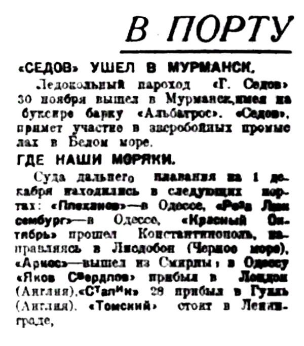 Суда дальнего плавания на 1 декабря находилась в следующих портах: "Плеханов" — в Одессе, "Роза Люксембург" — в Одессе. "Красный Октябрь" прошел Константинополь, направляясь в Лисдобон (Черное море), "Аркос" — вышел из Смирны в Одессу. "Яков Свердлов" прибыл в Лондон (Англия). "Сталин" прибыл в Гулль (Англия). "Томский" стоит в Ленинграде.