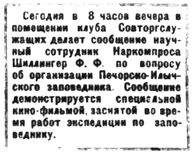 Сегодня в 8 часов вечера в помещении клуба Совторгслужащих делает сообщение научный сотрудник Наркомпроса Шиллингер Ф. Ф. по вопросу об организации Печорско-Илычского заповедника. Сообщение демонстрируется специальной кино-фильмой заснятой во время работ экспедиции по заповеднику.