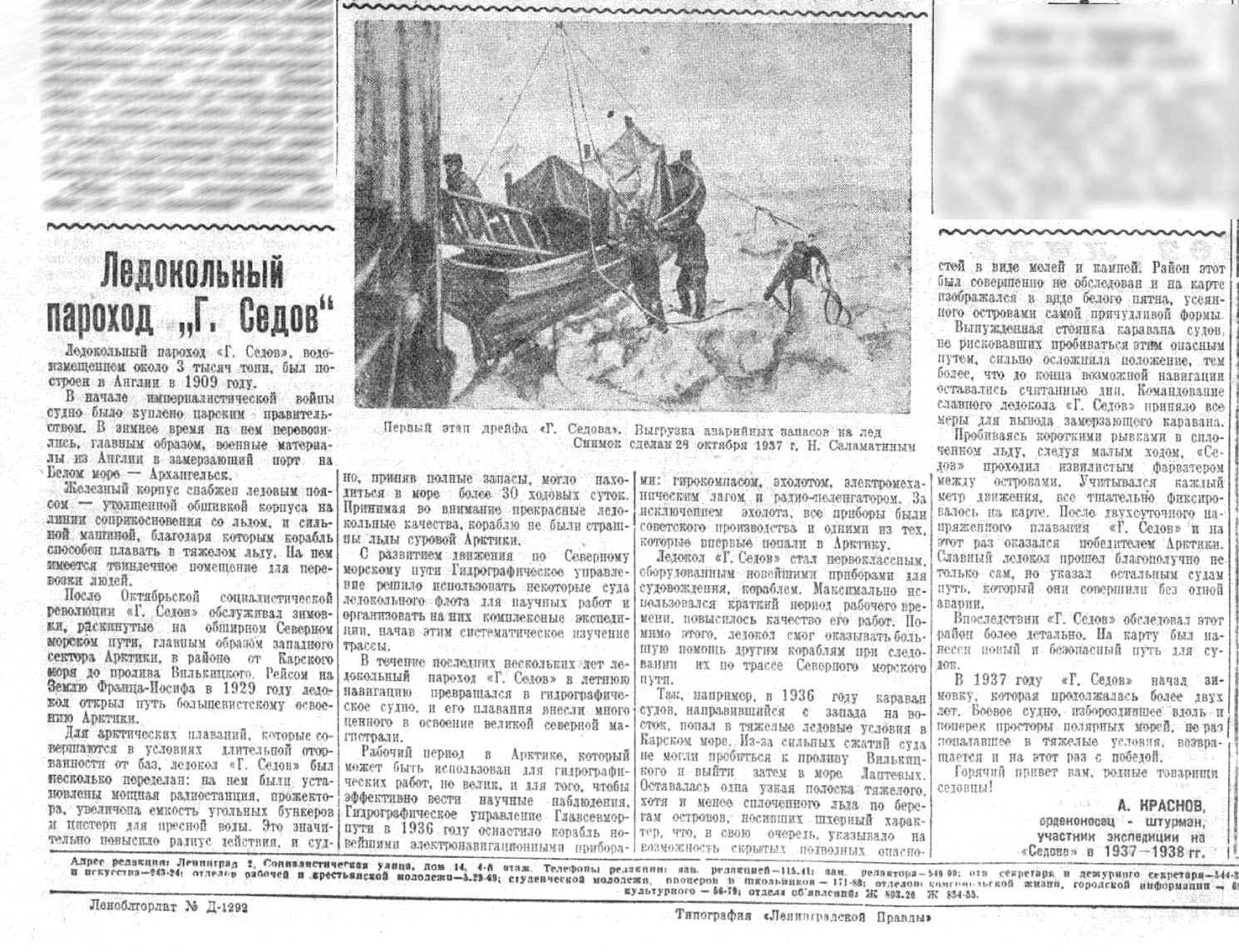 Краснов А.Ледокольный пароход "Г.Седов"//Смена 17 января 1940г., № 14 (4438)